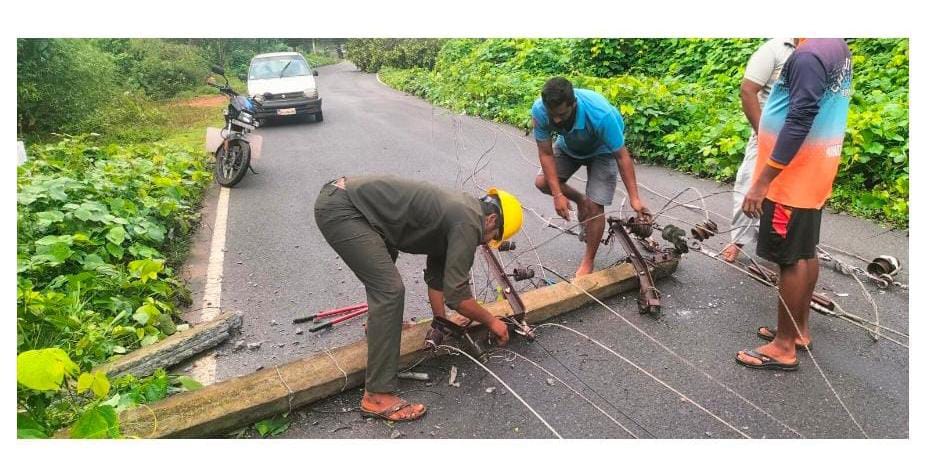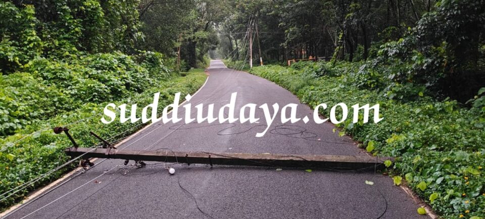 ಮುಂಡಾಜೆ: ಕಡಿರುದ್ಯಾವರ ಗ್ರಾಮದ ಇಂದಬೆಟ್ಟು ಕ್ರಾಸ್ ಬಳಿಯಿಂದ ಬಸವದೊಡ್ದುವರೆಗೆ ಮೂರು ವಿದ್ಯುತ್ ಕಂಬಗಳು ರಸ್ತೆಗೆ ಬಿದ್ದು ವಿದ್ಯುತ್ ತಂತಿಗಳು ರಸ್ತೆಯಲ್ಲಿಯೇ ಹರಡಿಕೊಂಡಿವೆ. ತಕ್ಷಣ ಸ್ಪಂಧಿಸಿದ ಮೆಸ್ಕಾಂ ಅಧಿಕಾರಿಗಳು