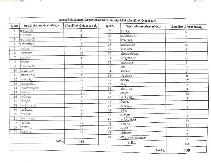 ಅಧಿಕ ಮಳೆಯಾದ ಸಂದರ್ಭದಲ್ಲಿ ತೆರೆಯಲಾಗುವ ಕಾಳಜಿ ಕೇಂದ್ರಗಳಿಗೆ ಅಥವಾ ಸಂಬಂಧಿಕರ ಮನೆಗಳಿಗೆ ತೆರಳುವಂತೆ ನೋಟಿಸಿನಲ್ಲಿ ಸೂಚಿಸಲಾಗಿದೆ. ಬೆಳ್ತಂಗಡಿ ಪಟ್ಟಣ ಪಂಚಾಯತ್ ವ್ಯಾಪ್ತಿಯಲ್ಲಿ 6 ಮನೆಗಳಿಗೆ ನೋಟೀಸು ನೀಡಲಾಗಿದ್ದು ತಾಲೂಕಿನಲ್ಲಿ ಒಟ್ಟು 438 ಮನೆಗಳಿಗೆ ನೋಟೀಸು ನೀಡಲಾಗಿದೆ.