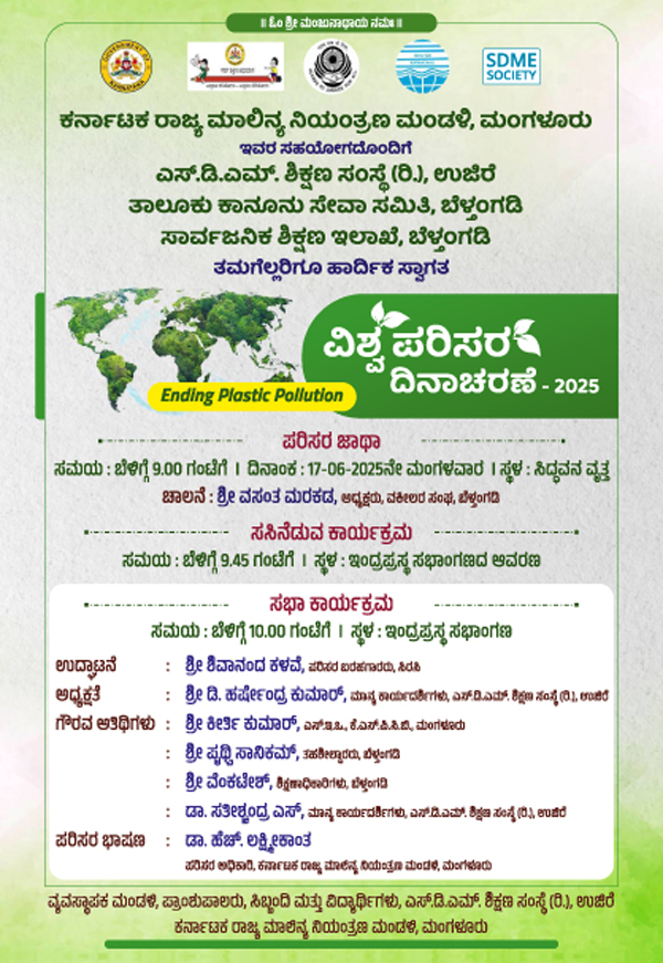 ಉಜಿರೆ :ವಿಶ್ವ ಪರಿಸರ ದಿನಾಚರಣೆ ಅಂಗವಾಗಿ ಜೂ.17 ರಂದು ಉಜಿರೆ ಶ್ರೀ ಧರ್ಮಸ್ಥಳ ಮಂಜುನಾಥೇಶ್ವರ ಶಿಕ್ಷಣ ಸಂಸ್ಥೆ, ಕರ್ನಾಟಕ ರಾಜ್ಯ ಮಾಲಿನ್ಯ ನಿಯಂತ್ರಣ ಮಂಡಳಿ, ಮಂಗಳೂರು; ತಾಲೂಕು ಕಾನೂನು ಸೇವಾ ಸಮಿತಿ, ಬೆಳ್ತಂಗಡಿ; ಸಾರ್ವಜನಿಕ ಶಿಕ್ಷಣ ಇಲಾಖೆ, ಬೆಳ್ತಂಗಡಿ ಇವರ ಸಹಯೋಗದೊಂದಿಗೆ ಪರಿಸರ ಜಾಥಾ ಬೆಳಿಗ್ಗೆ 9.00 ಗಂಟೆಗೆ ಸಿದ್ಧವನ ವೃತ್ತದಿಂದ ಉಜಿರೆ ಪೇಟೆಯವರೆಗೆ ನಡೆಯಲಿರುವುದು.