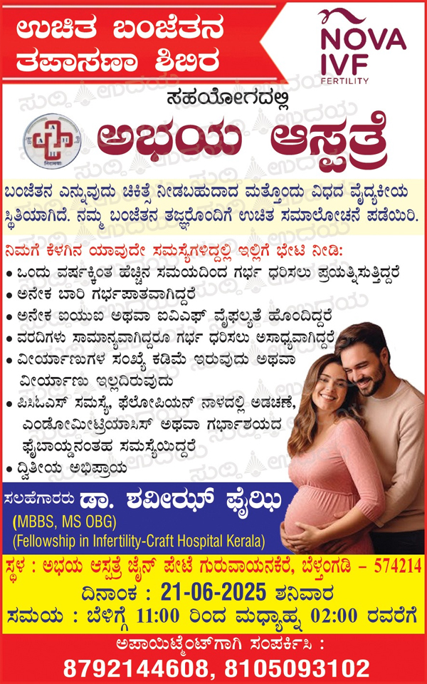 ಗುರುವಾಯನಕೆರೆ: NOVA IVF FERTILITY ಸಹಯೋಗದಲ್ಲಿ ಬಂಜೆತನ ತಪಾಸಣಾ ಶಿಬಿರವು ಜೂ.21ರಂದು ಬೆಳಿಗ್ಗೆ 11ರಿಂದ ಮಧ್ಯಾಹ್ನ 2ರವರೆಗೆ ಗುರುವಾಯನಕೆರೆ ಅಭಯ ಆಸ್ಪತ್ರೆಯಲ್ಲಿ ನಡೆಯಲಿದೆ.