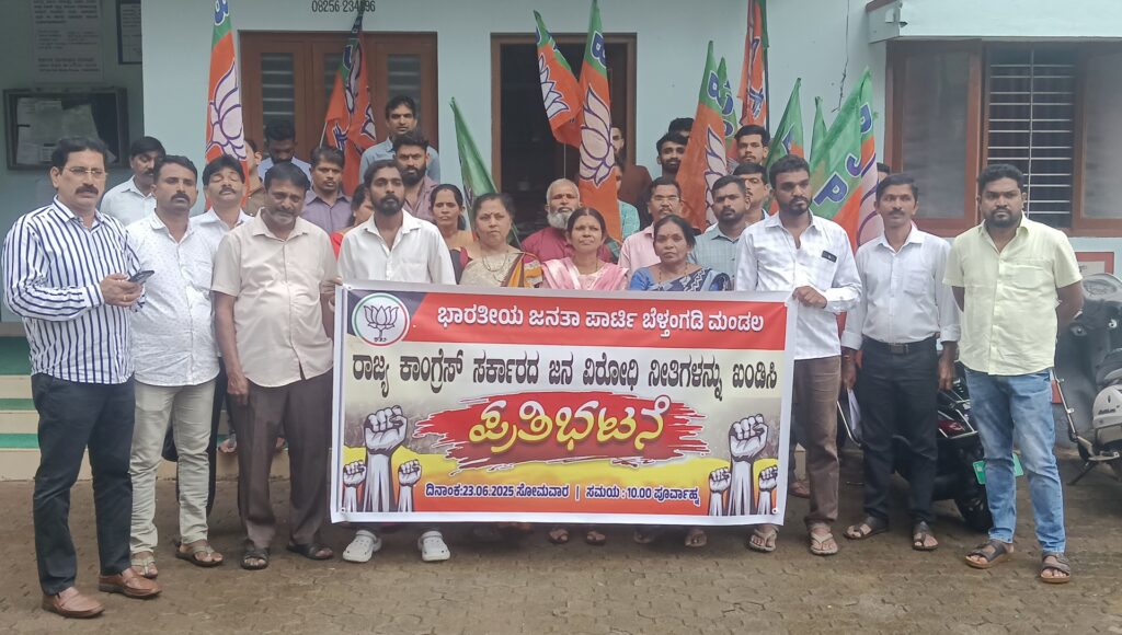 ಬೆಳ್ತಂಗಡಿ: ಭಾರತೀಯ ಜನತಾ ಪಾರ್ಟಿ ಬೆಳ್ತಂಗಡಿ ಮಂಡಲ ಇದರ ವತಿಯಿಂದ ರಾಜ್ಯ ಕಾಂಗ್ರೆಸ್ ಸರ್ಕಾರದ ಜನವಿರೋಧಿ ನೀತಿಯನ್ನು ಖಂಡಿಸಿ, ಬಿಜೆಪಿ ಮಂಡಲ ಪ್ರಧಾನ ಕಾರ್ಯದರ್ಶಿ ಹಾಗೂ ಪಟ್ಟಣ ಪಂಚಾಯತ್ ಅಧ್ಯಕ್ಷ ಜಯಾನಂದ ಗೌಡ ಪ್ರಜ್ವಲ್ ಇವರ ನೇತೃತ್ವದಲ್ಲಿ ಬೆಳ್ತಂಗಡಿ ಪಟ್ಟಣ ಪಂಚಾಯತ್ ಎದುರು ಜೂ.23 ರಂದು ಪ್ರತಿಭಟನೆ ನಡೆಯಿತು.