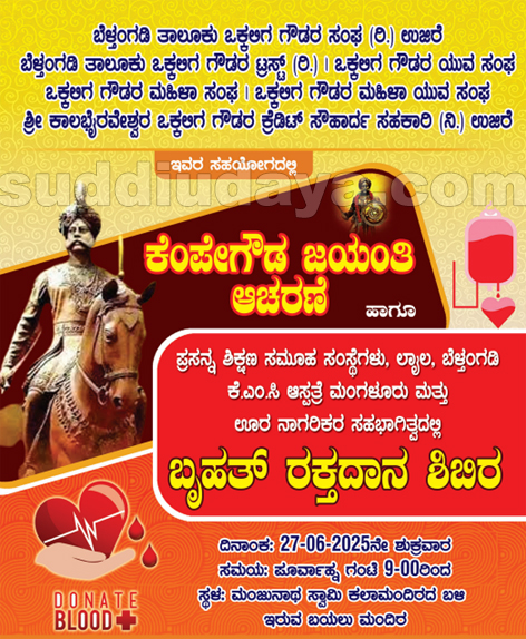 ಪ್ರಸನ್ನ ಶಿಕ್ಷಣ ಸಮೂಹ ಸಂಸ್ಥೆಗಳು ಲಾಯಿಲ, ಕೆ.ಎಂ.ಸಿ ಆಸ್ಪತ್ರೆ ಮಂಗಳೂರು ಮತ್ತು ಊರ ನಾಗರಿಕರ ಸಹಭಾಗಿತ್ವದಲ್ಲಿ ಬೃಹತ್ ರಕ್ತದಾನ ಶಿಬಿರ ಜೂ. 27 ರಂದು ಸಮಯ ಪೂರ್ವಾಹ್ನ ಗಂಟೆ 9-00ರಿಂದ ಮಂಜುನಾಥ ಸ್ವಾಮಿ ಕಲಾಮಂದಿರದ ಬಳಿ ಇರುವ ಬಯಲು ಮಂದಿರದಲ್ಲಿ ನಡೆಯಲಿದೆ.