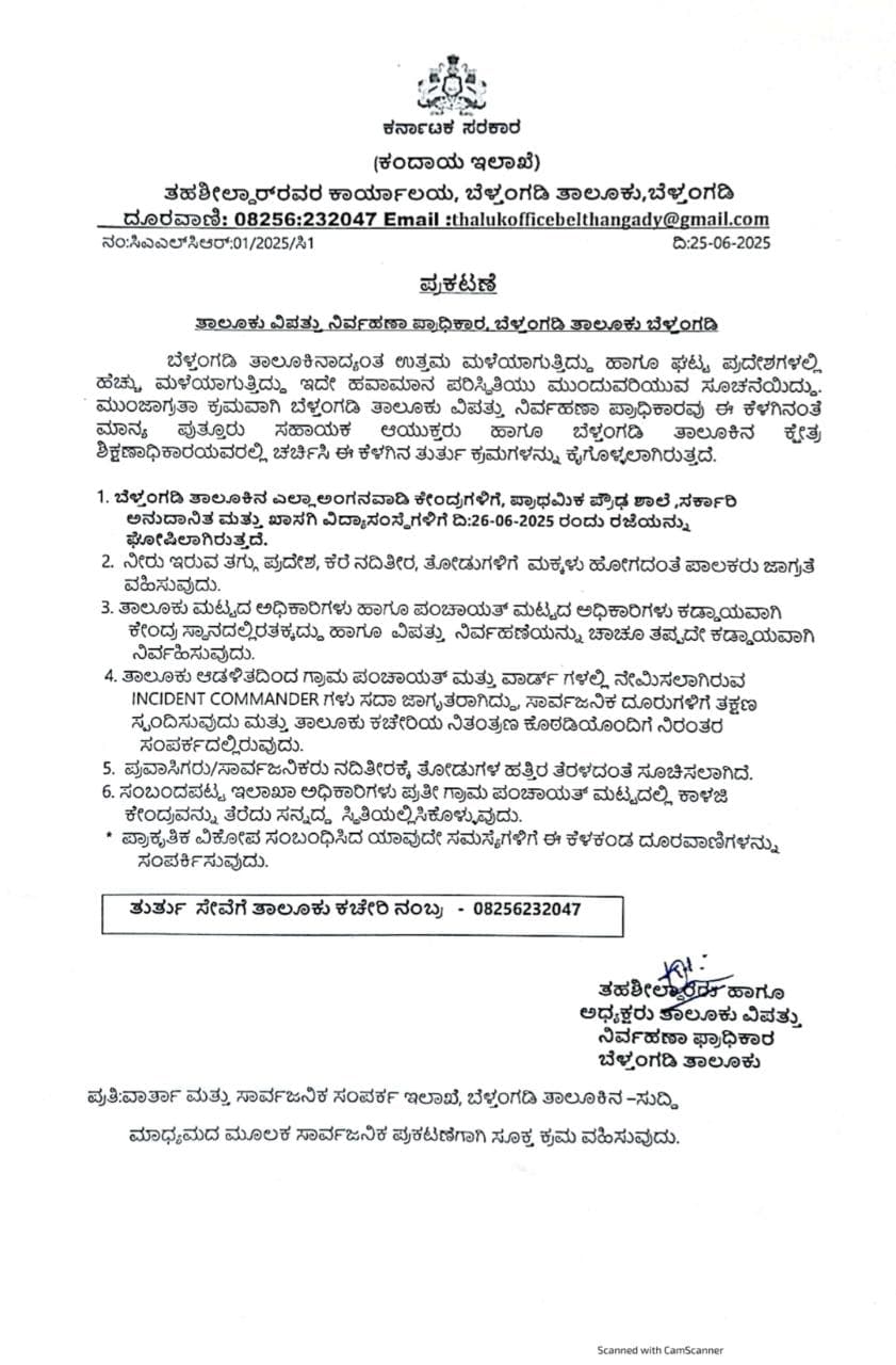 ಬೆಳ್ತಂಗಡಿ: ತಾಲೂಕಿನಾಧ್ಯಂತ ನಿರಂತರವಾಗಿ ಭಾರೀ ಮಳೆ ಸುರಿಯುತ್ತಿರುವ ಹಿನ್ನಲೆಯಲ್ಲಿ ಬೆಳ್ತಂಗಡಿ ತಾಲೂಕಿನ ಎಲ್ಲ ಅಂಗನವಾಡಿಗಳಿಗೆ ಹಾಗೂ ಪ್ರಾಥಮಿಕ ಹಾಗೂ ಪ್ರೌಢಶಾಲೆಗಳಿಗೆ ಜೂನ್ 26 ಗುರುವಾರದಂದು ರಜೆ ನೀಡಿ ಬೆಳ್ತಂಗಡಿ ತಹಶಿಲ್ದಾರ್ ಪೃಥ್ವಿ ಸಾನಿಕಂ ಆದೇಶ ಹೊರಡಿಸಿದ್ದಾರೆ.
