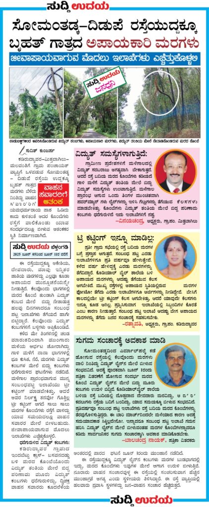 ಕಡಿರುದ್ಯಾವರ-ಮಿತ್ತಬಾಗಿಲು- ಮಲವಂತಿಗೆ ಗ್ರಾಮ ಪಂಚಾಯತ್ ವ್ಯಾಪ್ತಿಗೆ ಒಳಪಡುವ ಸೋಮಂತಡ್ಕ – ದಿಡುಪೆ ರಸ್ತೆಯ ಉದ್ದಕ್ಕೂ ಬೃಹತ್ ಗಾತ್ರದ ಮರಗಳು ಬೆಳೆದು ನಿಂತಿದ್ದು ವಾಹನ ಸವಾರರಿಗೆ ಯಮಧರ್ಮರಾಯ ಪಾಶ ಹಿಡಿದು ಕಾದು ಕುಳಿತಂತೆ ಅದರ ಕೊಂಬೆಗಳು ರಸ್ತೆಗೆ ವಾಲಿಕೊಂಡು ಯಾವ ಸಂದರ್ಭದಲ್ಲೂ ಬೀಳುವ ಆತಂಕಕರ ಸ್ಥಿತಿ ನಿರ್ಮಾಣವಾಗಿದೆ ಎಂದು ಜೂ. 5 ರಂದು ಸುದ್ದಿ ಉದಯ ಪತ್ರಿಕೆಯಲ್ಲಿ ವರದಿ ಪ್ರಕಟಿಸಿತ್ತು.