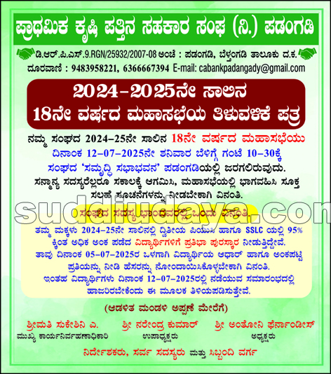 ಪಡಂಗಡಿ ಪ್ರಾಥಮಿಕ ಕೃಷಿ ಪತ್ತಿನ ಸಹಕಾರ ಸಂಘದ 2024-25ನೇ ಸಾಲಿನ 18ನೇ ವರ್ಷದ ಮಹಾಸಭೆಯು ಜು.12 ರಂದು ಬೆಳಿಗ್ಗೆ ಗಂಟೆ 10-30ಕ್ಕೆ ಸಂಘದ ‘ಸಮೃದ್ಧಿ ಸಭಾಭವನ’ ಪಡಂಗಡಿಯಲ್ಲಿ ಜರಗಲಿರುವುದು.