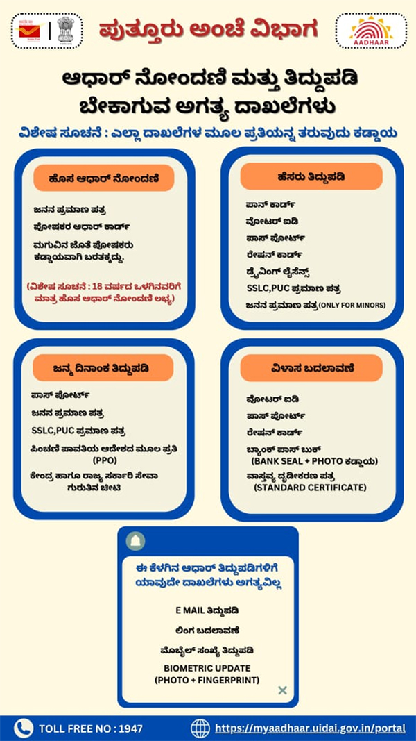 ಬೆಳ್ತಂಗಡಿ: ಗ್ಯಾರಂಟಿ ಯೋಜನೆಗಳ ತಾಲೂಕು ಅನುಷ್ಟಾನ ಸಮಿತಿ, ತಾಲೂಕು ಪಂಚಾಯತ್, ಬೆಳ್ತಂಗಡಿ ಮತ್ತು ಭಾರತೀಯ ಅಂಚೆ ಇಲಾಖೆ, ಪುತ್ತೂರು ವಿಭಾಗ ಇವುಗಳ ಸಹಯೋಗದಲ್ಲಿ ಆ.04 ರಂದು ಪೂರ್ವಾಹ್ನ:10.00 ಗಂಟೆಯಿಂದ ಬೆಳ್ತಂಗಡಿ ತಾಲೂಕು ಪಂಚಾಯತ್ ಸಭಾಂಗಣದಲ್ಲಿ ಆಧಾರ್ ನೋಂದಣಿ ಮತ್ತು ತಿದ್ದುಪಡಿ ಶಿಬಿರ, ಅಂಚೆ ಇಲಾಖೆಯ ವಿಶೇಷ ಸೇವಾ ಸೌಲಭ್ಯಗಳ ಮಾಹಿತಿ ಕಾರ್ಯಕ್ರಮ ಆರೋಗ್ಯ ಮತ್ತು ಅಪಘಾತ ವಿಮಾ ಶಿಬಿರವನ್ನು ಏರ್ಪಡಿಸಲಾಗಿರುವುದಾಗಿ ಕಾರ್ಯನಿರ್ವಾಹಕ ಅಧಿಕಾರಿ ಭವಾನಿಶಂಕರ್ ಎನ್ ಮತ್ತು ಭಾರತೀಯ ಅಂಚೆ ಕಛೇರಿ, ಪುತ್ತೂರು ವಿಭಾಗದ ಮಾರ್ಕೇಟಿಂಗ್ ಮ್ಯಾನೇಜರ್ ಗುರುಪ್ರಸಾದ್ ಜಂಟಿ ಪ್ರಕಟಣೆಯಲ್ಲಿ ತಿಳಿಸಿದ್ದಾರೆ.