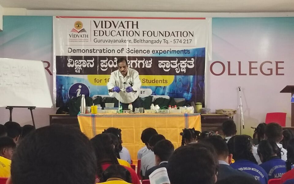 ಬೆಳ್ತಂಗಡಿ: ವಿದ್ವತ್ ಪಿಯು ಕಾಲೇಜು ಗುರುವಾಯನಕೆರೆ ಇದರ ಇನ್ಸ್ಪೈರ್ ವಿದ್ವತ್ ಸೈನ್ಸ್ ಫೋರಂ ಇದರ ಆಶ್ರಯದಲ್ಲಿ ಆಯೋಜಿಸಿದ ಹತ್ತನೇ ತರಗತಿಯ ಪಠ್ಯಪುಸ್ತಕದಲ್ಲಿ ಎನ್ ಸಿ ಇ ಆರ್ ಟಿ ಮಾರ್ಗಸೂಚಿಯ ಪ್ರಕಾರ ನೀಡಿದ “ವಿಜ್ಞಾನ ಪ್ರಯೋಗಗಳ ಪ್ರಾತ್ಯಕ್ಷತೆ” ಕಾರ್ಯಕ್ರಮವು ಯಶಸ್ವಿಯಾಗಿ ನಡೆಯಿತು.