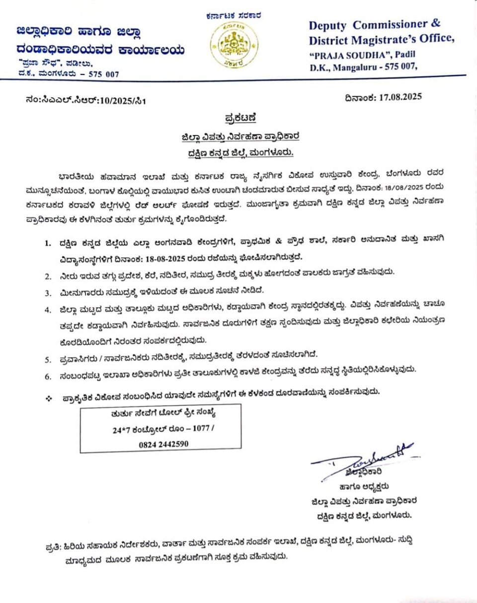 ದಕ್ಷಿಣಕನ್ನಡ ಜಿಲ್ಲೆಯಲ್ಲಿ ಅತೀ ಹೆಚ್ಚು ಮಳೆಯಾಗಿದ್ದು, ಈ ಹಿನ್ನೆಲೆ ಆ.18 ರಂದು ಎಲ್ಲಾ ಅಂಗನವಾಡಿ ಕೇಂದ್ರಗಳು, ಸರ್ಕಾರಿ ಹಾಗೂ ಖಾಸಗಿ ಪ್ರಾಥಮಿಕ ಶಾಲೆ, ಪ್ರೌಢಶಾಲೆಗಳಿಗೆ ರಜೆ ಘೋಷಿಸಿ ಜಿಲ್ಲಾಧಿಕಾರಿ ಆದೇಶ ನೀಡಿದ್ದಾರೆ.