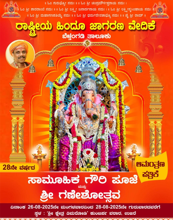 ಶ್ರೀ ಗಣೇಶೋತ್ಸವವು ಉಜಿರೆಯ ಕುಂಜರ್ಪದಲ್ಲಿ ಆ.26 ರಿಂದ 28ರವರೆಗೆ ಜರುಗಲಿದೆ.