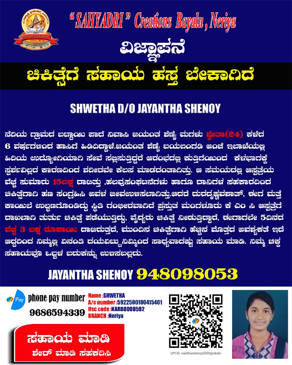 ಬೆಳ್ತಂಗಡಿ: ನೆರಿಯ ಗ್ರಾಮದ ಬಟ್ಟಾಯಿ ಪಾದೆ ನಿವಾಸಿ ಜಯಂತ ಶೆಣೈ ಮಗಳು ಶ್ವೇತಾ (24ವ) ಕಳೆದ 6 ವರ್ಷಗಳಿಂದ ಹಾಸಿಗೆ ಹಿಡಿದಿದ್ದಾರೆ. ಜಯಂತ ಶೆಣೈ ಬೈಲಂಗಡಿ ಅಂಚೆ ಇಲಾಖೆಯಲ್ಲಿ ಹಿರಿಯ ಉದ್ಯೋಗಿಯಾಗಿ ಸೇವೆ ಸಲ್ಲಿಸುತ್ತಿದ್ದಾರೆ.