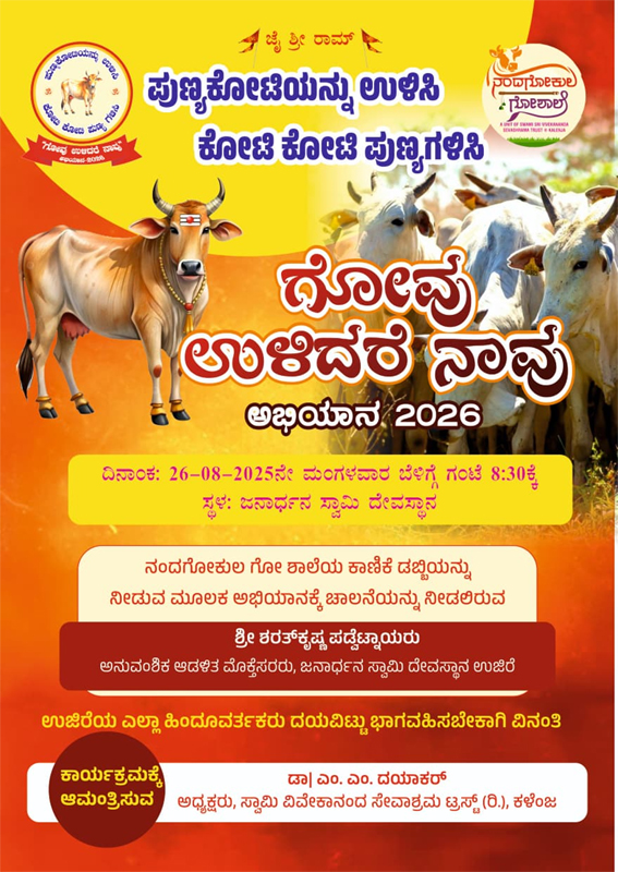 ಉಜಿರೆ: ಸೂರ್ಯೋದಲ್ಲಿ ಎದ್ದು ಪ್ರತಿ ದಿನ 8 ಶುಭ ವಸ್ತುಗಳ ದರುಶನ ಮಾಡಬೇಕು ಎಂದು ಹಿಂದೂ ಧರ್ಮಸಾರುತ್ತದೆ. ಅವುಗಳಲ್ಲಿ ಪ್ರಥಮ ಸ್ಥಾನಲ್ಲಿ ಇರುವುದೇ ಗೋವು. ಗೋವು ರಕ್ಷಣೆ ನಮ್ಮ ನಿಮ್ಮೆಲ್ಲರ ಕರ್ತವ್ಯವಾಗಿದ್ದು ಆ.26ರಂದು ಉಜಿರೆಯಲ್ಲಿ “ಗೋವು ಉಳಿದರೆ ನಾವು” ಅಭಿಯಾನ 2026 ನಡೆಯಲಿದೆ.