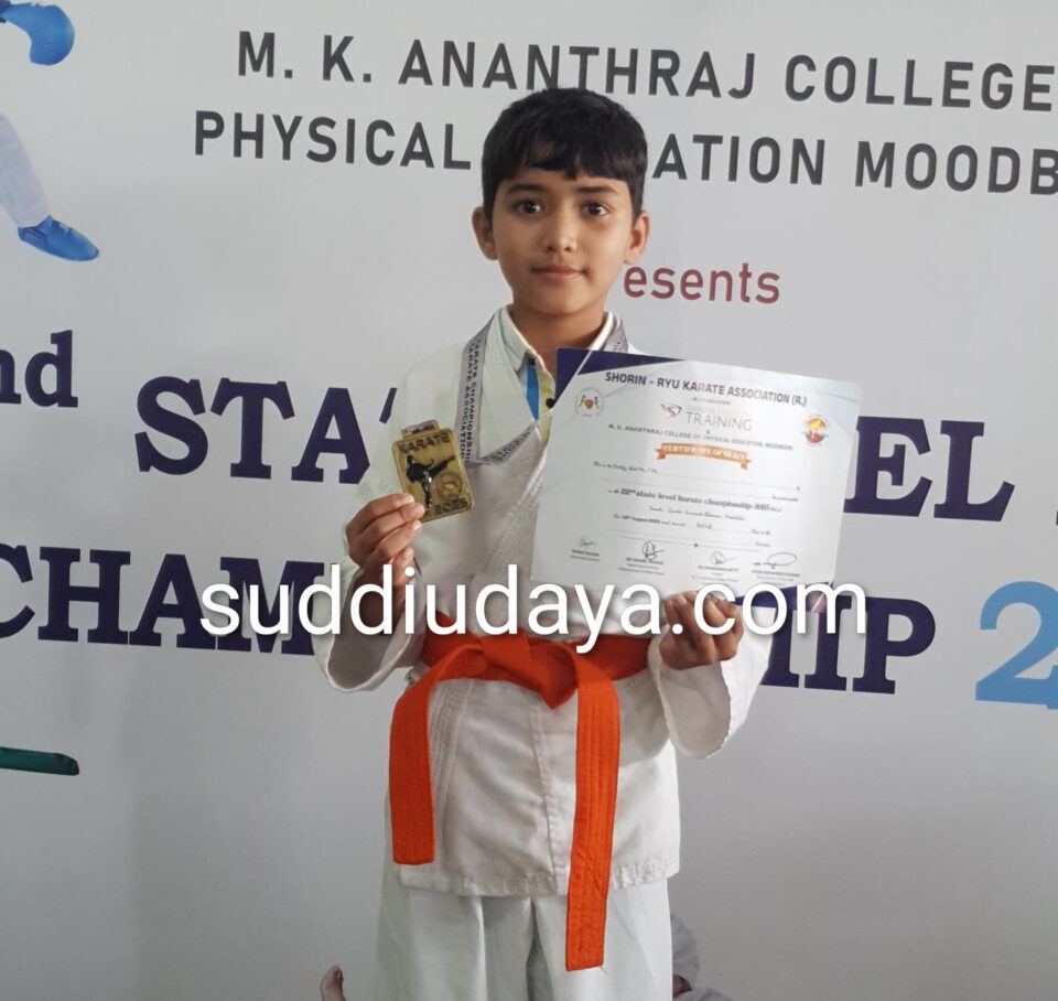 ಬೆಳ್ತಂಗಡಿ: ಶೊರಿನ್ ರಿಯೋ ಕರಾಟೆ ಅಸೋಸಿಯೇಷನ್ ಹಾಗೂ ಸ್ವಾಮೀಸ್ ಸ್ಟ್ರೆಂತ್ ಟ್ರೈನಿಂಗ್ ಮತ್ತು ಎಂ.ಕೆ. ಅನಂತರಾಜು ದೈಹಿಕ ಶಿಕ್ಷಣ ಕಾಲೇಜು ವತಿಯಿಂದ ಸೆ.1ರಂದು ಮೂಡಬಿದ್ರೆಯ ಸ್ಕೌಟ್ಸ್ ಅಂಡ್ ಗೈಡ್ಸ್ ಭವನದಲ್ಲಿ ನಡೆದ ರಾಜ್ಯಮಟ್ಟದ ಕರಾಟೆ ಚಾಂಪಿಯನ್ಶಿಪ್ ಪಂದ್ಯಕೂಟದಲ್ಲಿ ಉಸ್ಮಾನ್ ಆದಿಲ್ ರವರು ಕುಮಿಟೆ ವಿಭಾಗದಲ್ಲಿ ಪ್ರಥಮ ಸ್ಥಾನವನ್ನು ಪಡೆದಿರುತ್ತಾರೆ.