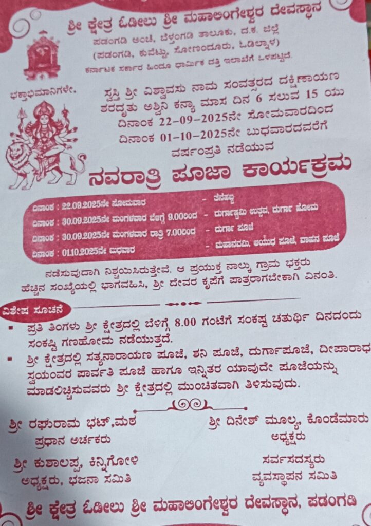 Uncategorizedಸೆ.22ರಿಂದ ಅ.1: ಓಡೀಲು ಮಹಾಲಿಂಗೇಶ್ವರ ದೇವಸ್ಥಾನದಲ್ಲಿ ನವರಾತ್ರಿ ಮಹೋತ್ಸವ by Suddi UdayaSeptember 19, 2025September 19, 2025 Share0 Share this:Post Print (Opens in new window) Print Email a link to a friend (Opens in new window) Email Tweet Share on WhatsApp (Opens in new window) WhatsApp