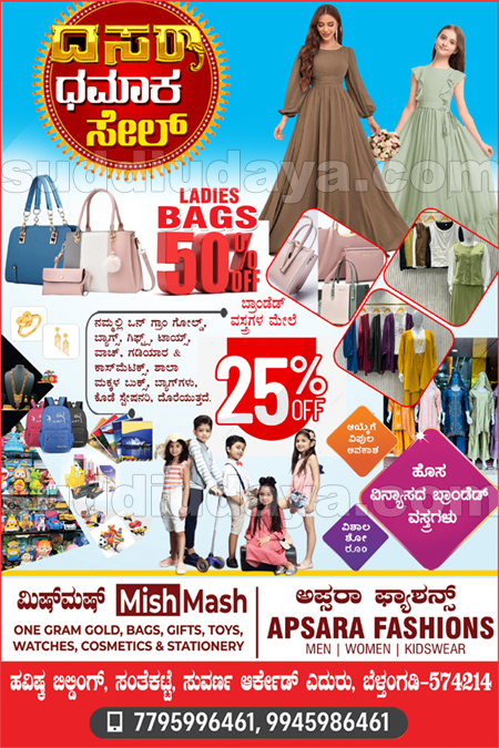 ಬೆಳ್ತಂಗಡಿ: ಸಂತೆಕಟ್ಟೆ ಸುವರ್ಣ ಆರ್ಕೇಡ್ನ ಎದುರಿನ ಹವಿಷ್ಕ ಕಾಂಪ್ಲೆಕ್ಸ್ ನಲ್ಲಿ ಕಾರ್ಯಾಚರಿಸುತ್ತಿರುವ ಅಪ್ಸರಾ ಫ್ಯಾಶನ್ ಸೆಂಟರ್ ಹಾಗೂ ಮಿಷ್ಮಷ್ ಫ್ಯಾನ್ಸಿ & ಗಿಫ್ಟ್ ಸೆಂಟರಿನಲ್ಲಿ ದಸರಾ ಧಮಾಕ ಸೇಲ್ ಪ್ರಾರಂಭಗೊಂಡಿದ್ದು ಪ್ರತಿ ಖರೀದಿಯ ಮೇಲೆ ರಿಯಾಯಿತಿ ಸಿಗಲಿದೆ.