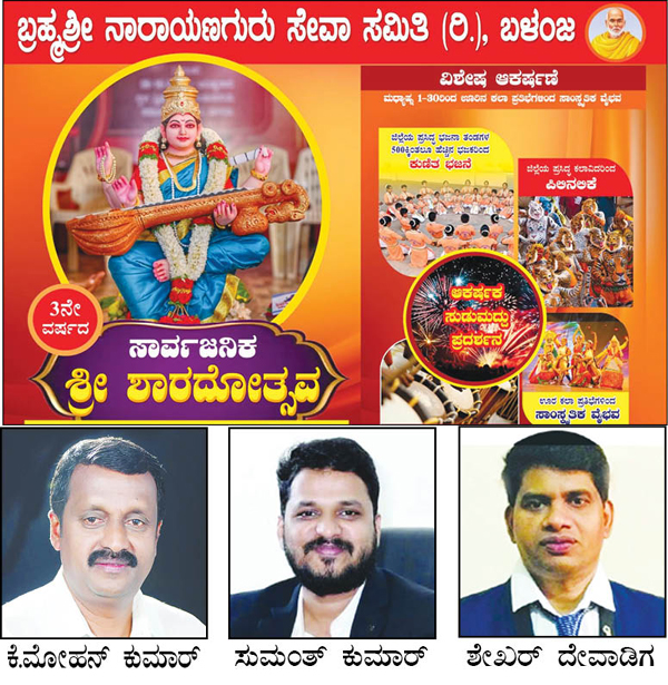 ಬಳಂಜ: ಕಳೆದ ನಾಲ್ಕೂವರೆ ದಶಕಗಳ ಭವ್ಯ ಪರಂಪರೆಯಿರುವ ಜಿಲ್ಲಾ ರಾಜ್ಯೋತ್ಸವ ಪ್ರಶಸ್ತಿ ಪುರಸ್ಕೃತ ಬಳಂಜ ಬ್ರಹ್ಮಶ್ರೀ ನಾರಾಯಣಗುರು ಸೇವಾ ಸಮಿತಿಯು ವಿನೂತನ ಕಾರ್ಯಕ್ರಮಗಳ ಮೂಲಕ ಎಲ್ಲರ ಗಮನ ಸೆಳೆದ ಸಂಘಟನೆಯಾಗಿದೆ. ಸಂಘದ ನೇತೃತ್ವದಲ್ಲಿ ಹಾಗೂ ಊರವರ ಸಹಕಾರದೊಂದಿಗೆ ತೃತೀಯ ವರ್ಷದ ಸಾರ್ವಜನಿಕ ಶ್ರೀ ಶಾರದೋತ್ಸವವು ಸೆ.28 ರಂದು ವಿವಿಧ, ವೈದಿಕ, ಧಾರ್ಮಿಕ, ಸಾಂಸ್ಕೃತಿಕ ಮತ್ತು ಭಜನಾ ಕಾರ್ಯಕ್ರಮಗಳೊಂದಿಗೆ ಬಳಂಜ ಬ್ರಹ್ಮಶ್ರೀ ನಾರಾಯಣಗುರು ಸಮುದಾಯ ಭವನದಲ್ಲಿ ವಿಜೃಂಭಣೆಯಿದ ಜರುಗಲಿದೆ ಎಂದು ಸಮಿತಿ ಅಧ್ಯಕ್ಷ ಸಂತೋಷ್ ಪಿ ಕೋಟ್ಯಾನ್ ಬಳಂಜ ತಿಳಿಸಿದ್ದಾರೆ.