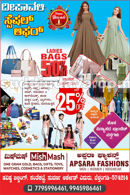 ಬೆಳ್ತಂಗಡಿ: ಸಂತೆಕಟ್ಟೆ ಸುವರ್ಣ ಆರ್ಕೇಡ್ನ ಎದುರಿನ ಹವಿಷ್ಕ ಕಾಂಪ್ಲೆಕ್ಸ್ ನಲ್ಲಿ ಕಾರ್ಯಾಚರಿಸುತ್ತಿರುವ ಅಪ್ಸರಾ ಫ್ಯಾಶನ್ ಸೆಂಟರ್ ಹಾಗೂ ಮಿಷ್ಮಷ್ ಫ್ಯಾನ್ಸಿ & ಗಿಫ್ಟ್ ಸೆಂಟರಿನಲ್ಲಿ ದೀಪಾವಳಿ ಸ್ಪೆಷಲ್ ಆಫರ್ ಪ್ರಾರಂಭಗೊಂಡಿದ್ದು ಪ್ರತಿ ಖರೀದಿಯ ಮೇಲೆ ರಿಯಾಯಿತಿ ಸಿಗಲಿದೆ.