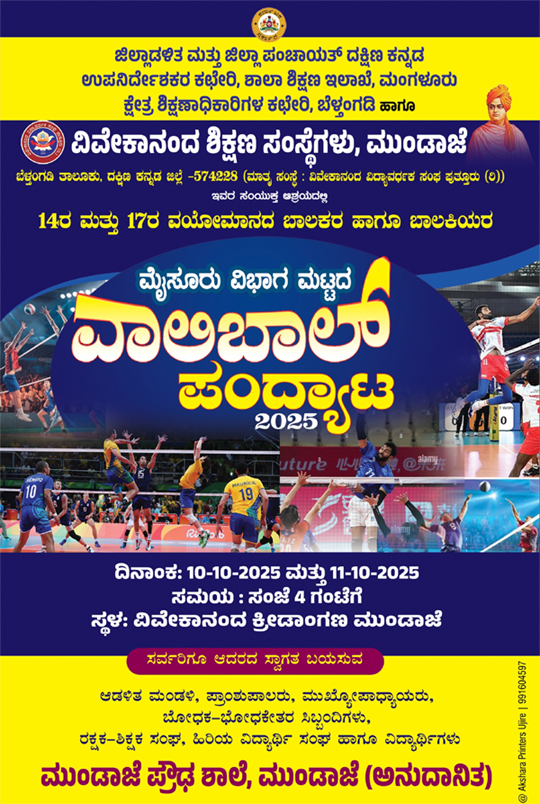 ಬೆಳ್ತಂಗಡಿ: ಜಿಲ್ಲಾಡಳಿತ ಮತ್ತು ಜಿಲ್ಲಾ ಪಂಚಾಯತ್ ದಕ್ಷಿಣ ಕನ್ನಡ ಉಪ ನಿರ್ದೇಶಕರ ಕಚೇರಿ, ಶಾಲಾ ಶಿಕ್ಷಣ ಇಲಾಖೆ, ಮಂಗಳೂರು ಕ್ಷೇತ್ರ ಶಿಕ್ಷಣಾಧಿಕಾರಿಗಳ ಕಚೇರಿ, ಬೆಳ್ತಂಗಡಿ ಮತ್ತು ವಿವೇಕಾನಂದ ಶಿಕ್ಷಣ ಸಂಸ್ಥೆಗಳು, ಮುಂಡಾಜೆ ಬೆಳ್ತಂಗಡಿ ತಾಲೂಕು, ದ.ಕ. ವಿವೇಕಾನಂದ ವಿದ್ಯಾವರ್ಧಕ ಸಂಘ ಪುತ್ತೂರು ಇವರ ಸಂಯುಕ್ತ ಆಶ್ರಯದಲ್ಲಿ 14ರ ಮತ್ತು 17ರ ವಯೋಮಾನದ ಬಾಲಕರ ಹಾಗೂ ಬಾಲಕಿಯರ ಮೈಸೂರು ವಿಭಾಗ ಮಟ್ಟದ ಹೊನಲು ಬೆಳಕಿನ ವಾಲಿಬಾಲ್ ಪಂದ್ಯಾಟ ಅ.10ರಿಂದ 11ರವರೆಗೆ ಮುಂಡಾಜೆ ವಿವೇಕಾನಂದ ಕ್ರೀಡಾಂಗಣದಲ್ಲಿ ನಡೆಯಲಿದೆ.