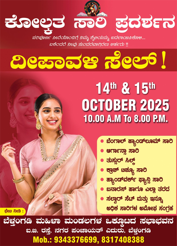 ಪರಿಪೂರ್ಣ ಸೀರೆಯೊಂದಿಗೆ ನಿಮ್ಮ ಶೈಲಿಯನ್ನು ಪರಿವರ್ತಿಸಲು ಬೆಳ್ತಂಗಡಿ ತಾಲೂಕು ಮಹಿಳಾ ಮಂಡಲಗಳ ಒಕ್ಕೂಟದ ಸಭಾಭವನದಲ್ಲಿ ಕೋಲ್ಕತ್ತಾ ಸೀರೆ ಮೇಳವು ಅ.14 ಮತ್ತು 15 ರಂದು ನಡೆಯಲಿದೆ.