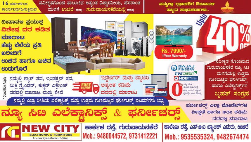 ಗುರುವಾಯನಕೆರೆ-ಉಜಿರೆ ನ್ಯೂ ಸಿಟಿ ಎಲೆಕ್ಟ್ರಾನಿಕ್ಸ್ ನಲ್ಲಿ ದೀಪಾವಳಿ ಪ್ರಯುಕ್ತ ಶೇ.40ರಷ್ಟು ಡಿಸ್ಕೌಂಟ್ ಸೇಲ್