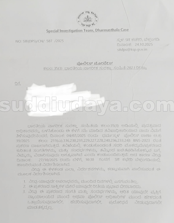 ಬೆಳ್ತಂಗಡಿ ಎಸ್.ಐ.ಟಿ ಕಚೇರಿಗೆ ಅ.27 ರಂದು ಸೋಮವಾರ 10 :30 ಕ್ಕೆ ವಿಚಾರಣೆಗೆ ಹಾಜರಾಗಲು ಮಹೇಶ್ ಶೆಟ್ಟಿ ತಿಮರೋಡಿ, ಗಿರೀಶ್ ಮಟ್ಟಣ್ಣವರ್, ಜಯಂತ್ ಟಿ, ವಿಠಲ್ ಗೌಡನಿಗೆ ಅ.24 ರಂದು ನೋಟಿಸ್ ಜಾರಿ ಮಾಡಿದ್ದಾರೆ.