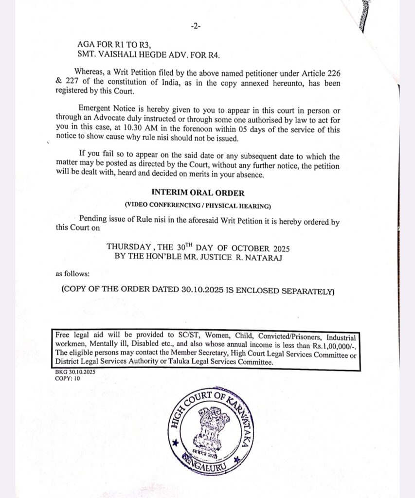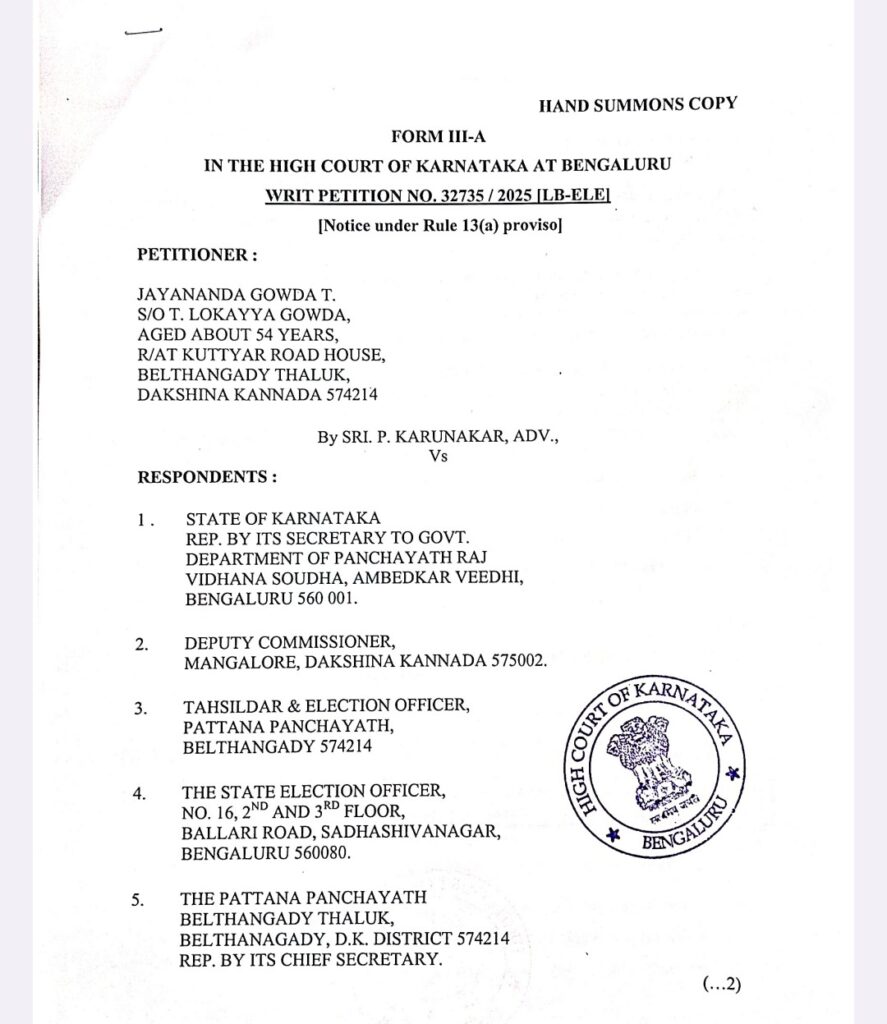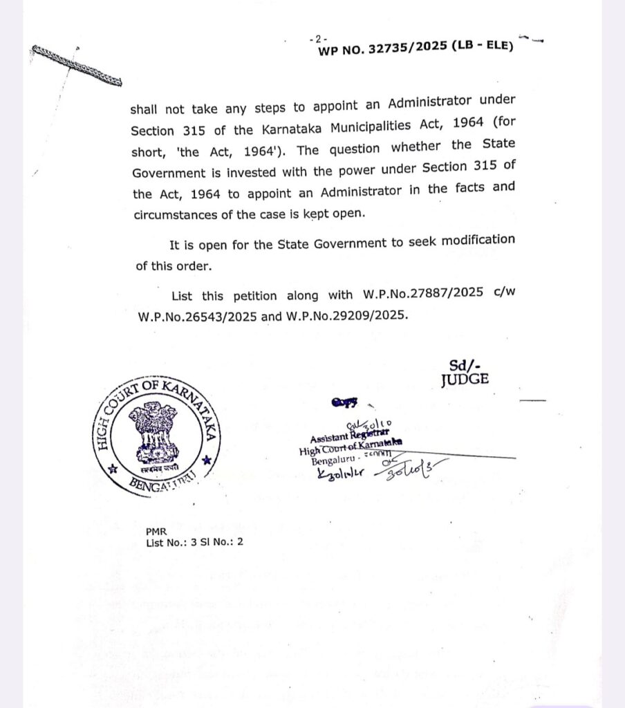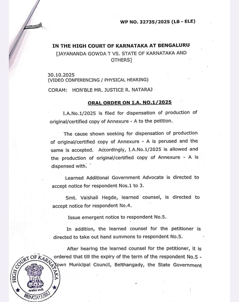 ನ.7 ರಂದು ಚುನಾಯಿತ ಸದಸ್ಯರ ಅಧಿಕಾರಾವಧಿ ಮುಗಿಯಲಿರುವ ಬೆಳ್ತಂಗಡಿ ಪಟ್ಟಣ ಪಂಚಾಯತ್‌ ಗೆ ಆಡಳಿತಾಧಿಕಾರಿಗಳನ್ನು ನೇಮಕ ಮಾಡದಂತೆ ರಾಜ್ಯ ಹೈಕೋರ್ಟ್ ಮಧ್ಯಂತರ ತಡೆ