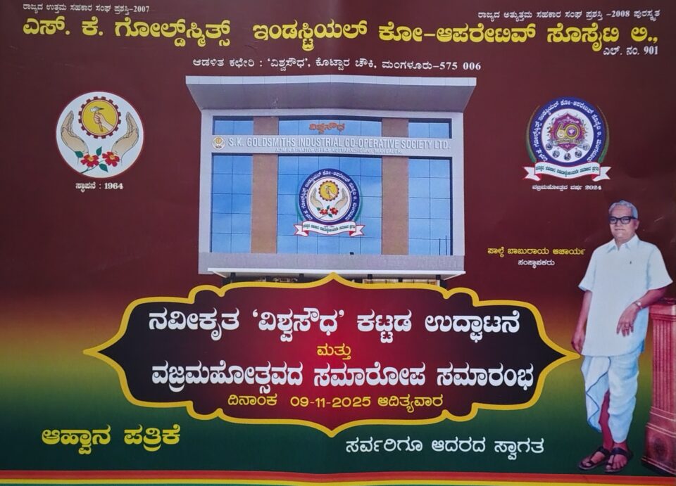 ಮಂಗಳೂರು: ಎಸ್.ಕೆ. ಗೋಲ್ಡ್ ಸ್ಮಿತ್ಸ್ ಇಂಡಸ್ಟ್ರಿಯಲ್ ಕೋ-ಆಪರೇಟಿವ್ ಸೊಸೈಟಿಯ ನವೀಕೃತ ವಿಶ್ವಸೌಧ ಕಟ್ಟಡ ಉದ್ಘಾಟನೆ ಮತ್ತು ವಜ್ರಮಹೋತ್ಸವದ ಸಮಾರೋಪ ಸಮಾರಂಭವು ನ.11ರಂದು ಕೊಟ್ಟಾರಚೌಕಿ ಆಡಳಿತ ಕಚೇರಿ ಬಳಿ ನಡೆಯಲಿದೆ.