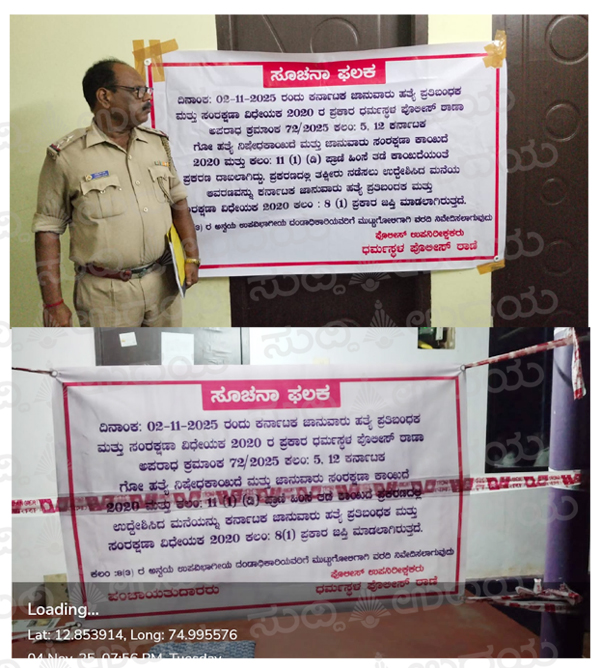 ಧರ್ಮಸ್ಥಳ: ಅಕ್ರಮವಾಗಿ ಕಾರಿನಲ್ಲಿ ಗೋಮಾಂಸ ಮಾಡಲು ಮೂರು ದನಗಳನ್ನು ಸಾಗಾಟ ಮಾಡಿ ಪೊಲೀಸರಿಗೆ ಸಿಕ್ಕಿಬಿದ್ದಿದ್ದ ಇಬ್ಬರು ಆರೋಪಿಗಳಲ್ಲಿ ಎರಡನೇ ಆರೋಪಿ ಮಹಮ್ಮದ್ ಸಿನಾನ್ ರವರ ಮನೆಯನ್ನು ಧರ್ಮಸ್ಥಳ ಪೊಲೀಸರು ಮುಟ್ಟುಗೋಳು ಹಾಕಿ ಜಪ್ತಿ ಮಾಡಿದ್ದಾರೆ.