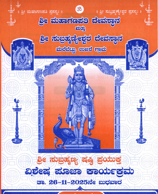 ನ. 26: ಮಲೆಬೆಟ್ಟು ಶ್ರೀ ಮಹಾಗಣಪತಿ, ಶ್ರೀ ಸುಬ್ರಹ್ಮಣೇಶ್ವರ ದೇವಸ್ಥಾನದಲ್ಲಿ ಷಷ್ಠಿ ವಿಶೇಷ ಪೂಜೆ