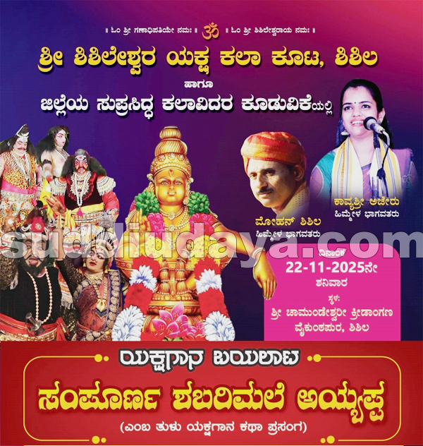 ಶಿಶಿಲ : ಶ್ರೀ ಶಿಶಿಲೇಶ್ವರ ಯಕ್ಷ ಕಲಾ ಕೂಟ, ಶಿಶಿಲ ಹಾಗೂ ಜಿಲ್ಲೆಯ ಸುಪ್ರಸಿದ್ದ ಕಲಾವಿದರ ಕೂಡುವಿಕೆಯಲ್ಲಿ ಯಕ್ಷಗಾನ ಬಯಲಾಟ ಸಂಪೂರ್ಣ ಶಬರಿಮಲೆ ಅಯ್ಯಪ್ಪ ಎಂಬ ತುಳು ಯಕ್ಷಗಾನ ಕಥಾ ಪ್ರಸಂಗವು ನ.22ರಂದು ಶಿಶಿಲ ವೈಕುಂಠಪುರ ಚಾಮುಂಡೇಶ್ವರೀ ಕ್ರೀಡಾಂಗಣದಲ್ಲಿ ನಡೆಯಲಿದೆ.