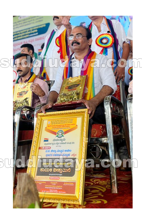 ನಾರಾವಿ: ಮಡಂತ್ಯಾರು ಪ್ರಾಥಮಿಕ ಕೃಷಿ ಪತ್ತಿನ ಸಹಕಾರಿ ಸಂಘದ ನೇತೃತ್ವದಲ್ಲಿ ಜರುಗಿದ 72 ನೇ ದಕ್ಷಿಣ ಕನ್ನಡ ಜಿಲ್ಲಾ ಮಟ್ಟದ ಅಖಿಲಾ ಭಾರತ ಸಹಕಾರ ಸಪ್ತಾಹದಲ್ಲಿ ನಾರಾವಿ ಪ್ರಾಥಮಿಕ ಕೃಷಿ ಪತ್ತಿನ ಸಹಕಾರಿ ಸಂಘದ ಮುಖ್ಯ ಕಾರ್ಯನಿರ್ವಹಣಾಧಿಕಾರಿ ಸಂಸ್ಥೆಯ ಬೆಳವಣಿಗೆಯಲ್ಲಿ ತೊಡಗಿಸಿಕೊಂಡಿರುವ ಎನ್. ಶಶಿಕಾಂತ್ ಜೈನ್ ಅವರಿಗೆ ಕಾಯಕ ದೀಕ್ಷಾಮಣಿ ಪ್ರಶಸ್ತಿ ಲಭಿಸಿದೆ.