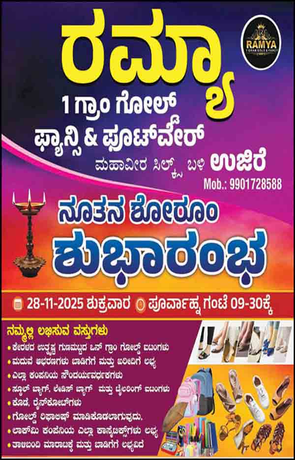 ಉಜಿರೆ: ಉಜಿರೆ ಪರಿಸರದಲ್ಲಿ ಕಳೆದ ಹಲವು ವರುಷಗಳಿಂದ ಗ್ರಾಹಕರ ಮನಗೆದ್ದು ಉದ್ಯಮ ಕ್ಷೇತ್ರದಲ್ಲಿ ಯಶಸ್ಸನ್ನು ಕಂಡ ಬಿಚಿತ್ರಾ ಮತ್ತು ಪ್ರಸಾದ್ ಬಿ.ಎಸ್. ಮಾಲಕತ್ವದ ರಮ್ಯಾ 1 ಗ್ರಾಂ ಗೋಲ್ಡ್ & ಫ್ಯಾನ್ಸಿ ಫೂಟ್ವೇರ್ ಇದರ ನೂತನ ಶೋರೂಂ ಶುಭಾರಂಭವು ನ.28 ರಂದು ಉಜಿರೆಯಲ್ಲಿ ಜರುಗಲಿದೆ.