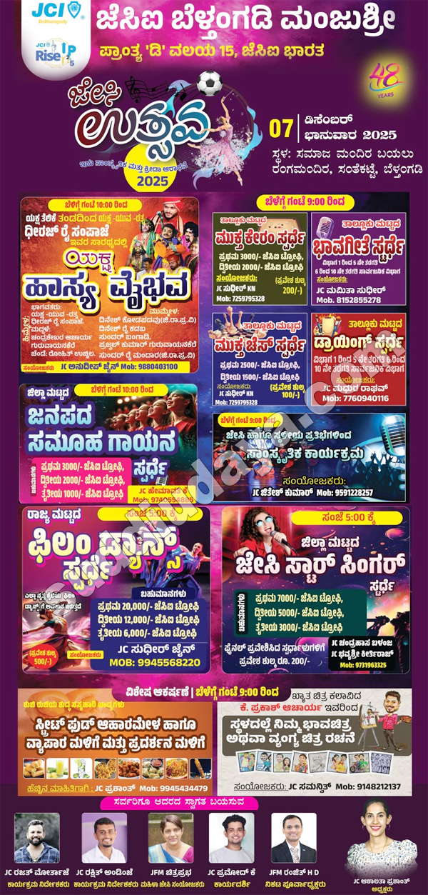 ಡಿ.7: ಬೆಳ್ತಂಗಡಿಯಲ್ಲಿ ಜೇಸಿ ಉತ್ಸವ, ವಿವಿಧ ಸ್ಪರ್ದೆಗಳು, ಸಾಂಸ್ಕೃತಿಕ ಕಾರ್ಯಕ್ರಮ, ಸಾಧನಾಶ್ರೀ ಪ್ರಶಸ್ತಿ