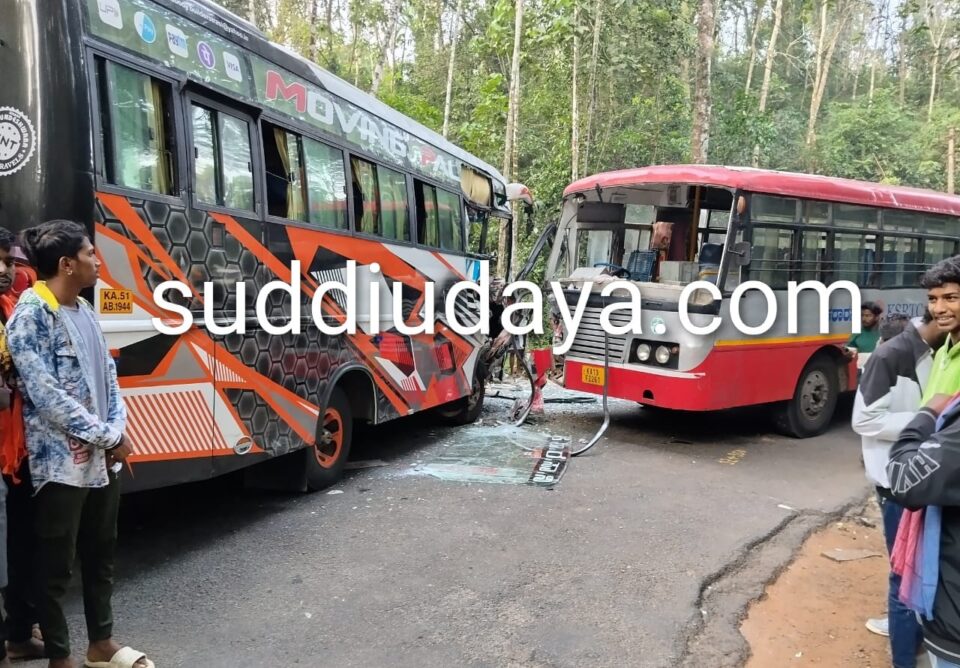 ಹಾಸನದಿಂದ ಧರ್ಮಸ್ಥಳ ಕಡೆ ಬರುತ್ತಿದ್ದ ಕೆ.ಎಸ್.ಆರ್.ಟಿ.ಸಿ ಹಾಗೂ ಧರ್ಮಸ್ಥಳ ಕಡೆಯಿಂದ ಕೊಕ್ಕಡ ಕಡೆ ಹೋಗುತ್ತಿದ್ದ ಅಯ್ಯಪ್ಪ ಮಾಲಾಧಾರಿಗಳು ಇದ್ದ ಖಾಸಗಿ ಬಸ್ ಗಳು ಆಗಿದ್ದು ಪ್ರಯಾಣಿಕರಿಗೆ ಹಾಗೂ ಚಾಲಕನಿಗೆ ಸಣ್ಣ ಪುಟ್ಟ ಗಾಯಗಳಾಗಿರುತ್ತದೆ. ಸುಮಾರು ಒಂದು ಗಂಟೆಗಳ ಕಾಲ ರಸ್ತೆ ಸಂಚಾರ ವ್ಯವಸ್ಥೆಯಲ್ಲಿ ವ್ಯತ್ಯಾಸಗಳು ಕಂಡು ಬಂದಿದ್ದು, ಸದ್ಯ ಸಂಚಾರ ಸರಿಯಾಗಿರುತ್ತದೆ.
