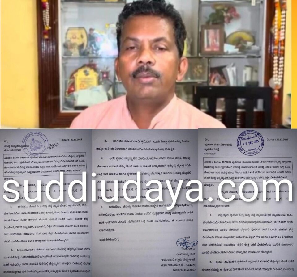 ಬೆಳ್ತಂಗಡಿ: ಧರ್ಮಸ್ಥಳ ಪ್ರಕರಣದಲ್ಲಿ ಆರೋಪಿಯಾಗಿರುವ ಚಿನ್ನಯ್ಯ ಸೌಜನ್ಯ ಹೋರಾಟಗಾರರ ವಿರುದ್ದ ಪೊಲೀಸರಿಗೆ ದೂರು ನೀಡಿದ್ದು. ಈ ದೂರು ನೀಡಲು ಒತ್ತಡ ಹಾಕಿ ನಡೆಸಿರುವ ಅಪರಾಧಿಕ ಪಿತೂರಿಯ ಬಗ್ಗೆ ತನಿಖೆ ನಡೆಸುವಂತೆ ಹಾಗೂ ಚಿನ್ನಯ್ಯನಿಗೆ ಸೂಕ್ತ ಪೊಲೀಸ್ ಬಂದೋಬಸ್ತ್ ಒದಗಿಸಿ ರಕ್ಷಣೆ ನೀಡುವಂತೆ ಸೌಜನ್ಯ ಪರ ಹೋರಾಟಗಾರ ಜಯಂತ್ ಟಿ ಮುಖ್ಯಮಂತ್ರಿ ಯವರಿಗೆ ಹಾಗೂ ರಾಜ್ಯ ಪೊಲೀಸ್ ಮಹಾ ನಿರ್ದೇಶಕರಿಗೆ ಡಿ.20 ರಂದು ಮನವಿ ಮಾಡಿದ್ದಾರೆ.