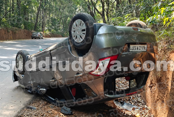 ಮುಂಡಾಜೆ: ಬಸ್ ಗೆ ಡಿಕ್ಕಿ ಹೊಡೆದು ಧರೆಗೆ ಗುದ್ದಿ ಪಲ್ಟಿಯಾದ ಕಾರು