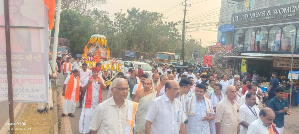 ಬೆಳಾಲು ಕ್ರಾಸ್ ನಿಂದ ಸ್ವಾಮೀಜಿಯವರನ್ನು ಉಜಿರೆ ಶ್ರೀ ಜನಾರ್ದನ ದೇವಸ್ಥಾನದತನಕ ಮೆರವಣಿಗೆಯಲ್ಲಿ ಕರೆತರಲಾಯಿತು.ವಸಂತ ಮಂಜಿತ್ತಾಯ,ಈಶ್ವರ ಪೆರ್ಲತ್ತಾಯ,ಸುಬ್ರಹ್ಮಣ್ಯ ಕಲ್ಲೂರಾಯ ಮತ್ತು ತಂಡದವರಿಂದ ವೇದ ಘೋಷ ನೆರವೇರಿಸಿದರು.