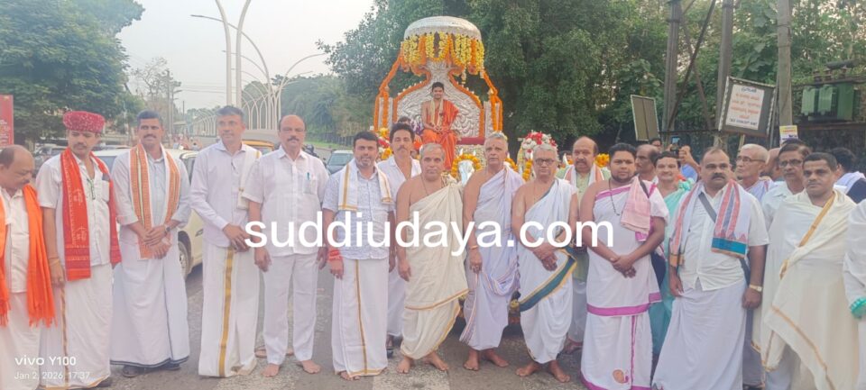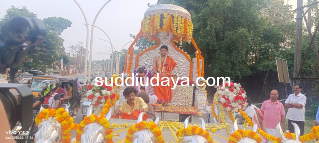 ಕೇರಳ ಶೈಲಿಯ ಚಂಡೆ ವಾದನ, ವಯೊಲಿನ್, 22 ತಂಡಗಳಿಂದ ಭಜನೆ, ಸ್ಯಾಕ್ಸೋಫೋನ್ ವಾದನದೊಂದಿಗೆ ಮೆರವಣಿಗೆ ಸಾಗಿ ಬಂತು.ದೇವಸ್ಥಾನದ ದ್ವಾರದ ಬಳಿ ಸ್ವಾಮೀಜಿಯವರನ್ನು ಶ್ರೀ ಜನಾರ್ದನ ದೇವಸ್ಥಾನದ ಅನುವಂಶಿಕ ಆಡಳಿತ ಮೊಕ್ತೇಸರ ಶರತ್ ಕೃಷ್ಣ ಪಡುವೆಟ್ನಾಯ ಅವರ ನೇತೃತ್ವದಲ್ಲಿ ಸ್ವಾಗತಿಸಲಾಯಿತು.ಬಳಿಕ ಅವರು ಶ್ರೀ ಜನಾರ್ದನ ದೇವರ ದರ್ಶನ ಪಡೆದರು. ನಂತರ ಸ್ವಾಮೀಜಿಯವರಿಗೆ ಪೌರ ಸನ್ಮಾನ ನಡೆಯಿತು.