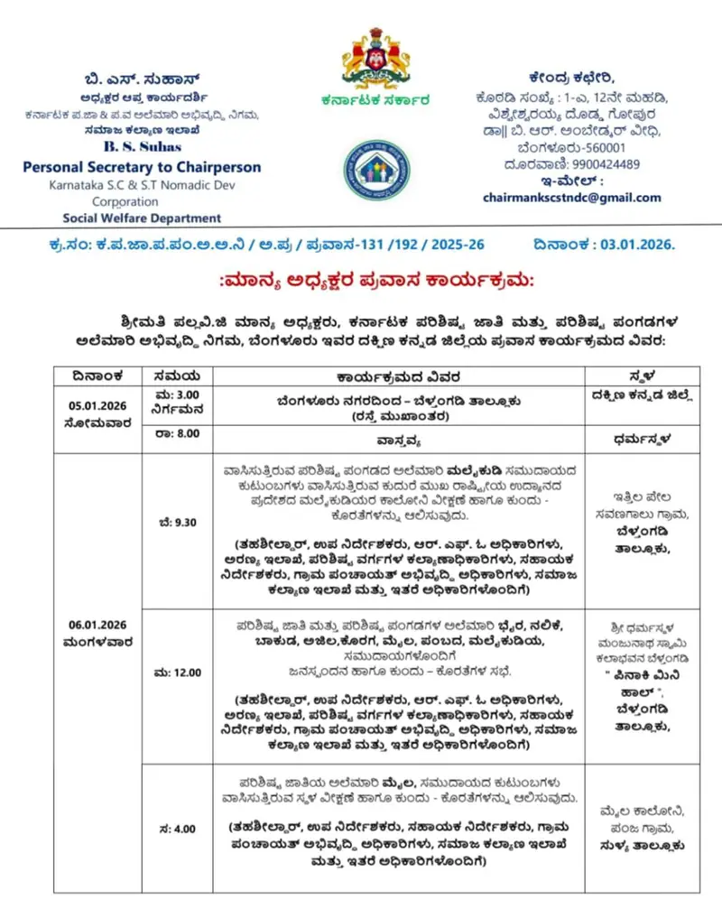ಜನವರಿ 5 ರಂದು ರಾತ್ರಿ ಧರ್ಮಸ್ಥಳಕ್ಕೆ ಆಗಮಿಸಲಿರುವ ಅವರು ಜನವರಿ 6 ರಂದು ಬೆಳಗ್ಗೆ 10 ಘಂಟೆಗೆ ಕುದುರೆಮುಖ ರಾಷ್ಟ್ರೀಯ ಉದ್ಯಾನವನ ವ್ಯಾಪ್ತಿಯ ಸವಣಾಲು ಗ್ರಾಮದ ಹಿತ್ತಿಲಪೇಲ ಮಲೆಕುಡಿಯ ಸಮುದಾಯದ ಕಾಲನಿಗೆ ಭೇಟಿ ನೀಡಿ ಅಲ್ಲಿ ಜನರ ಕುಂದುಕೊರತೆಗಳನ್ನು ಆಲಿಸುತ್ತಾರೆ. 11 ಘಂಟೆಗೆ ಬೆಳ್ತಂಗಡಿ ನಗರದ ಮಂಜುನಾಥ ಕಲಾ ಭವನದ ಪಿನಾಕಿ ಸಭಾಂಗಣದಲ್ಲಿ ಪ.ಜಾತಿ/ಪಂಗಡಗಳ ಅಲೆಮಾರಿ ಬೈರ , ನಲಿಕೆ , ಪಂಬದ , ಮಲೆಕುಡಿಯ ಸಮುದಾಯಗಳ ಜನಸ್ಪಂದನ ಮತ್ತು ಕುಂದುಕೊರತೆಗಳ ಬಗ್ಗೆ ಸಭೆ ನಡೆಸಲಿದ್ದಾರೆ. ಈ ಕಾರ್ಯಕ್ರಮದಲ್ಲಿ ತಾಲೂಕಿನ ಬೈರ, ನಲಿಕೆ, ಪಂಬದ, ಮಲೆಕುಡಿಯ ಸಮುದಾಯದ ಜನರು ಹೆಚ್ಚಿನ ಸಂಖ್ಯೆಯಲ್ಲಿ ಭಾಗವಹಿಸಬೇಕಾಗಿ ಸಮಾಜ ಕಲ್ಯಾಣ ಇಲಾಖೆಯ ಸಹಾಯಕ ನಿರ್ದೇಶಕ ಧನಂಜಯ ರವರು ಪ್ರಕಟಣೆಯಲ್ಲಿ ತಿಳಿಸಿದ್ದಾರೆ.