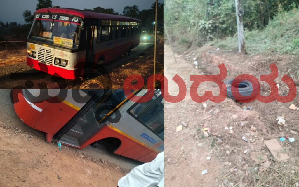 ದಾವಣಗೆರೆ- ಮಂಗಳೂರು ಕಡೆ ಸಂಚಾರಿಸುತ್ತಿದ್ದ ಕೆ.ಎಸ್.ಆರ್.ಟಿ.ಸಿ. ಬಸ್‌ನ ವೀಲ್ ಹಬ್ ತುಂಡರಿಸಿದ ಪರಿಣಾಮವಾಗಿ ಈ ಘಟನೆ ನಡೆದಿದೆ ಎನ್ನಲಾಗಿದೆ. ಬಸ್ ನಲ್ಲಿದ್ದ ಪ್ರಯಾಣಿಕರು ಅಪಾಯದಿಂದ ಪಾರಾಗಿದ್ದು, ಬದಲಿ ಬಸ್ ಮೂಲಕ ಪ್ರಯಾಣಿಕರನ್ನು ಕಳುಹಿಸುವ ಕೆಲಸವಾಗಿದೆ.