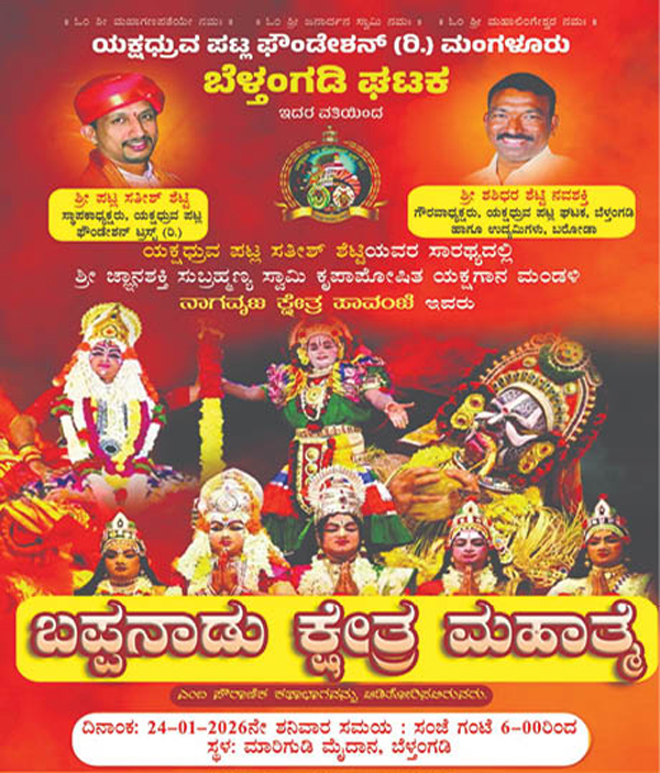 ಬೆಳ್ತಂಗಡಿ: ಯಕ್ಷಧ್ರುವ ಫೌಂಡೇಶನ್ ಮಂಗಳೂರು ಬೆಳ್ತಂಗಡಿ ಘಟಕ ಇದರ ವತಿಯಿಂದ ಯಕ್ಷಧ್ರುವ ಪಟ್ಲ ಸತೀಶ್ ಶೆಟ್ಟಿಯವರ ಸಾರಥ್ಯದಲ್ಲಿ ಶ್ರೀ ಜ್ಞಾನಶಕ್ತಿ ಸ್ವಾಮಿ ಕೃಪಾಪೋಷಿತ ಯಕ್ಷಗಾನ ಮಂಡಳಿ ನಾಗವೃಜ ಕ್ಷೇತ್ರ ಪಾವಂಜೆ ಇವರು ಜ.24 ರಂದು ಬೆಳ್ತಂಗಡಿ ಮಾರಿಗುಡಿ ಮೈದಾನದಲ್ಲಿ “ಬಪ್ಪನಾಡು ಕ್ಷೇತ್ರ ಮಹಾತ್ಮೆ” ಎಂಬ ಪೌರಾಣಿಕ ಕಥಾಭಾಗವನ್ನು ಆಡಿತೋರಿಸಲಿರುವರು ಎಂದು ಯಕ್ಷಧ್ರುವ ಪಟ್ಲ ಬೆಳ್ತಂಗಡಿ ಘಟಕದ ಪದಾಧಿಕಾರಿಗಳು ತಿಳಿಸಿದ್ದಾರೆ.