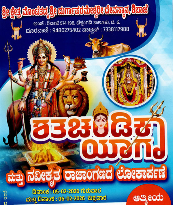 ಫೆ.5-6: ಶಿಬಾಜೆ ಶ್ರೀಕ್ಷೇತ್ರ ಮೊಂಟೆತಡ್ಕ ಶ್ರೀ ದುರ್ಗಾಪರಮೇಶ್ವರೀ ದೇವಸ್ಥಾನದಲ್ಲಿ ಶತಚಂಡಿಕಾಯಾಗ ಮತ್ತು ನವೀಕೃತ ರಾಜಾಂಗಣದ ಲೋಕಾರ್ಪಣೆ
