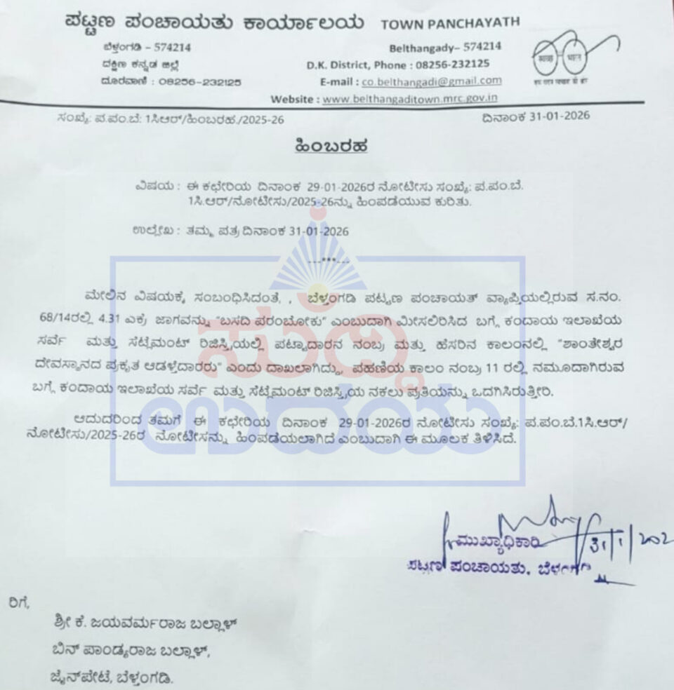 ಆದೇಶದಲ್ಲಿ ಏನಿದೆ:ಬೆಳ್ತಂಗಡಿ ಪಟ್ಟಣ ಪಂಚಾಯತ್ ವ್ಯಾಪ್ತಿಯಲ್ಲಿರುವ ಸ.ನಂ. 68/14ರಲ್ಲಿ 4.31 ಎಕ್ರೆ ಜಾಗವನ್ನು “ಬಸದಿ ಪರಂಬೋಕು” ಎಂಬುದಾಗಿ ಮೀಸಲಿರಿಸಿದ ಬಗ್ಗೆ ಕಂದಾಯ ಇಲಾಖೆಯ ಸರ್ವ ಮತ್ತು ಸೆಟ್ಗಮಂಟ್ ರಿಜಿಸ್ತಿಯಲ್ಲಿ ಪಟ್ಟಾದಾರನ ನಂಬ ಮತ್ತು ಹೆಸರಿನ ಕಾಲಂನಲ್ಲಿ “ಶಾಂತೇಶ್ವರ ದೇವಸ್ಥಾನದ ಪ್ರಕೃತ ಆಡಳೆದಾರರು” ಎಂದು ದಾಖಲಾಗಿದ್ದು, ಪಹಣಿಯ ಕಾಲಂ ನಂಬ್ರ 11 ರಲ್ಲಿ ನಮೂದಾಗಿರುವ ಬಗ್ಗೆ ಕಂದಾಯ ಇಲಾಖೆಯ ಸರ್ವೆ ಮತ್ತು ಸೆಟ್ಟೆಮಂಟ್ ರಿಜಿಸ್ಟ್ರಿಯ ನಕಲು ಪ್ರತಿಯನ್ನು ಒದಗಿಸಿರುತ್ತೀರಿ.ಆದುದರಿಂದ ತಮಗೆ ಈ ಕಛೇರಿಯ ದಿನಾಂಕ ಜ.29ರ ನೋಟೀಸು ಸಂಖ್ಯೆ: ಪ.ಪಂ.ಬೆ.1ಸಿ.ಆರ್/ನೋಟೀಸು/2025-26ರ ನೋಟೀಸನ್ನು ಹಿಂಪಡೆಯಲಾಗಿದೆಎಂದು ಪಟ್ಟಣ ಪಂಚಾಯತು,ಮುಖ್ಯಾಧಿಕಾರಿ ನೋಟಿಸಿನಲ್ಲಿ ತಿಳಿಸಿದ್ದಾರೆ.