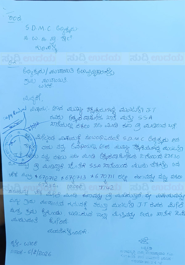 ಮುಖ್ಯ ಶಿಕ್ಷಕಿ ಅವರು ಶಾಲಾ ಅಕ್ಷರ ದಾಸೋಹ ಖಾತೆ ಮತ್ತು ಎಸ್.ಎಸ್.ಎ ಖಾತೆಯಲ್ಲಿ ನಕಲಿ ಸಹಿ ಮಾಡಿ ಹಣವನ್ನು ಡ್ರಾ( ಹಿಂಪಡೆಯುವುದು) ಮಾಡಿರುವ ಬಗ್ಗೆ ಎಸ್.ಡಿ.ಎಂ.ಸಿ ಅಧ್ಯಕ್ಷರು ಉಜಿರೆ ಗ್ರಾಮ ಪಂಚಾಯತ್ ಗೆ ದೂರು ನೀಡಿರುವುದು ವರದಿಯಾಗಿದೆ.