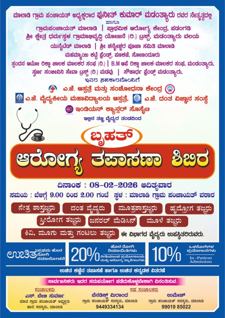 ನಾಳೆ(ಫೆ.8): ಮಾಲಾಡಿ ಗ್ರಾಮ ಪಂಚಾಯತ್‌ ವಠಾರದಲ್ಲಿ ಬೃಹತ್ ಆರೋಗ್ಯ ತಪಾಸಣಾ ಶಿಬಿರ