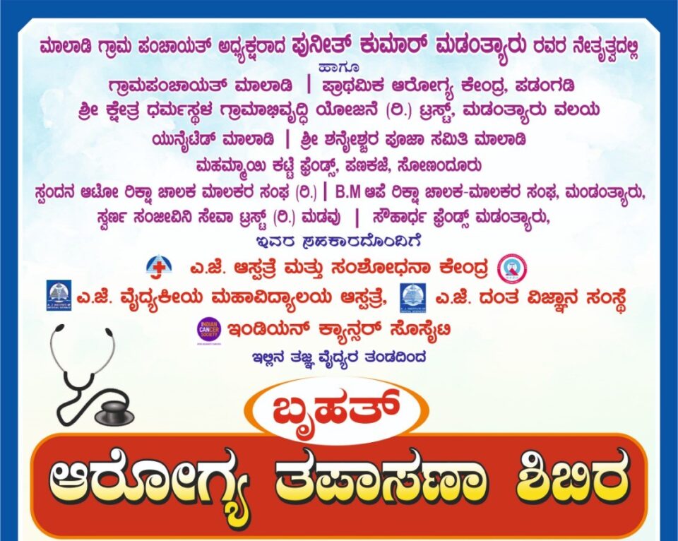 ಬೆಳ್ತಂಗಡಿ: ಮಾಲಾಡಿ ಗ್ರಾಮ ಪಂಚಾಯತ್‌ ಅಧ್ಯಕ್ಷರಾದ ಪುನೀತ್ ಕುಮಾರ್ ಮಡಂತ್ಯಾರು ರವರ ನೇತೃತ್ವದಲ್ಲಿಹಾಗೂ ಗ್ರಾಮ ಪಂಚಾಯತ್ ಮಾಲಾಡಿ, ಪ್ರಾಥಮಿಕ ಆರೋಗ್ಯ ಕೇಂದ್ರ ಪಡಂಗಡಿ,ಶ್ರೀ ಕ್ಷೇತ್ರ ಧರ್ಮಸ್ಥಳ ಗ್ರಾಮಾಭಿವೃದ್ಧಿ ಯೋಜನೆ ಮಡಂತ್ಯಾರು ವಲಯ,ಯುನೈಟೆಡ್ ಮಾಲಾಡಿ, ಶ್ರೀ ಶನೈಶ್ಚರ ಪೂಜಾ ಸಮಿತಿ ಮಾಲಾಡಿ, ಮಹಮ್ಮಾಯಿ ಕಟ್ಟೆ ಫ್ರೆಂಡ್ಸ್, ಪಣಕಜೆ, ಸೋಣಂದೂರು ಸ್ಪಂದನ ಆಟೋ ರಿಕ್ಷಾ ಚಾಲಕ ಮಾಲಕರ ಸಂಘ, | B.M ಆಪೆ ರಿಕ್ಷಾ ಚಾಲಕ-ಮಾಲಕರ ಸಂಘ, ಮಂಡಂತ್ಯಾರು, ಸ್ವರ್ಣ ಸಂಜೀವಿನಿ ಸೇವಾ ಟ್ರಸ್ಟ್ ಮಡವು, ಸೌಹಾರ್ಧ ಫ್ರೆಂಡ್ಸ್ ಮಡಂತ್ಯಾರು, ಇವರ ಸಹಕಾರದೊಂದಿಗೆ ಎ.ಜೆ. ಆಸ್ಪತ್ರೆ ಮತ್ತು ಸಂಶೋಧನಾ ಕೇಂದ್ರ, ಎ.ಜೆ. ವೈದ್ಯಕೀಯ ಮಹಾವಿದ್ಯಾಲಯ ಆಸ್ಪತ್ರೆ, ಎ.ಜೆ. ದಂತ ವಿಜ್ಞಾನ ಸಂಸ್ಥೆ ಇಂಡಿಯನ್ ಕ್ಯಾನ್ಸ‌ರ್ ಸೊಸೈಟಿ ಇಲ್ಲಿನ ತಜ್ಞ ವೈದ್ಯರ ತಂಡದಿಂದ ಫೆ.8ರಂದು ಮಾಲಾಡಿ ಗ್ರಾಮ ಪಂಚಾಯತ್ ವಠಾರದಲ್ಲಿ ಬೃಹತ್ ಆರೋಗ್ಯ ತಪಾಸಣಾ ಶಿಬಿರ ಜರುಗಲಿದೆ.