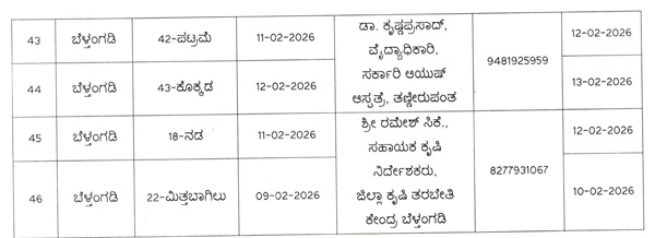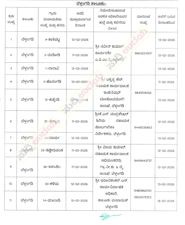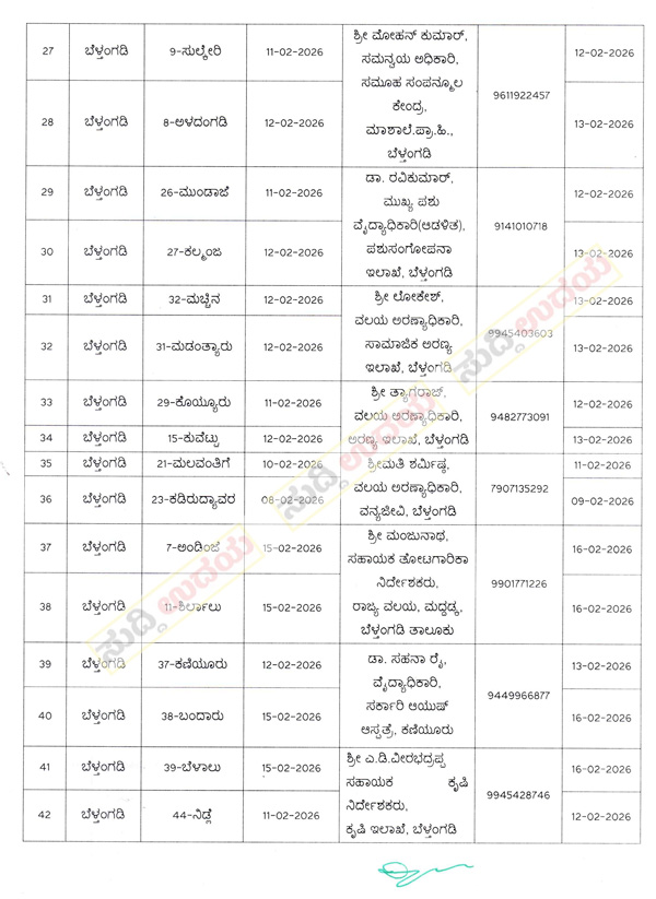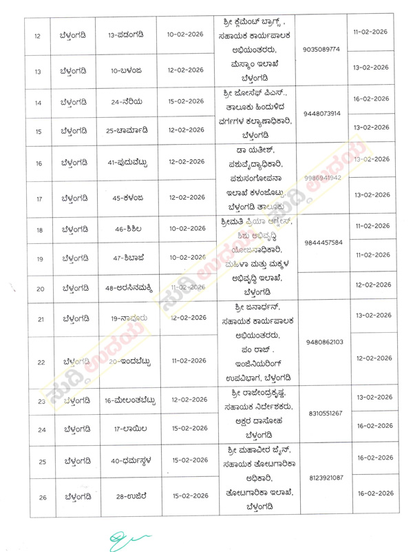 ಕಾಶಿಪಟ್ಣ, ಮರೋಡಿ ಹಾಗೂ ನಾರಾವಿಗೆ ಎಪಿಎಂಸಿ ಕಾರ್ಯದರ್ಶಿ ನವೀನ್ ಕುಮಾರ್, ಹೊಸಂಗಡಿ ಹಾಗೂ ಕುಕ್ಕೇಡಿಗೆ ಲೋಕೋಪಯೋಗಿ ಇಲಾಖೆಯ ಸಹಾಯಕ ಕಾರ್ಯಪಾಲಕ ಅಭಿಯಂತರ ಬಕ್ಕಪ್ಪ ಹೆಚ್, ತೆಕ್ಕಾರು ಹಾಗೂ ಬಾರ್ಯಗೆ ತೋಟಗಾರಿಕಾ ಹಿರಿಯ ಸಹಾಯಕ ನಿರ್ದೇಶಕ ಕೆ.ಎಸ್.ಚಂದ್ರಶೇಖರ್, ತಣ್ಣೀರುಪಂತ ಮತ್ತು ಇಳಂತಿಲಗೆ ಗ್ರಾಮೀಣ ಕುಡಿಯುವ ನೀರು ಮತ್ತು ನೈರ್ಮಲ್ಯ ಇಲಾಖೆಯ ಸಹಾಯಕ ಕಾರ್ಯಪಾಲಕ ಅಭಿಯಂತರ ವಿಜಯ್ ಕುಮಾರ್, ಕಳಿಯ ಹಾಗೂ ಮಾಲಾಡಿಗೆ ತಾಲೂಕು ಪಂಚಾಯತ್ ಕಾರ್ಯನಿರ್ವಾಹಕ ಅಧಿಕಾರಿ ಭವಾನಿಶಂಕರ್ ಎನ್., ಪಡಂಗಡಿ ಹಾಗೂ ಬಳಂಜಗೆ ಬೆಳ್ತಂಗಡಿ ಮೆಸ್ಕಾಂ ಇಲಾಖೆಯ ಸಹಾಯಕ ಕಾರ್ಯಪಾಲಕ ಅಭಿಯಂತರ ಕ್ಲೆಮೆಂಟ್ ಬೆಂಜಮಿನ್ ಬ್ರಾಗ್ಸ್, ನೆರಿಯ ಹಾಗೂ ಚಾರ್ಮಾಡಿಗೆ ಹಿಂದುಳಿದ ವರ್ಗಗಳ ಕಲ್ಯಾಣಾಧಿಕಾರಿ ಜೋಸೆಫ್ ಪಿಎಸ್, ಪುದುವೆಟ್ಟು-ಕಳಂಜಗೆ ಕಳಂಜೊಟ್ಟು ಪಶುಸಂಗೋಪನಾ ಇಲಾಖೆ ಪಶುವೈದ್ಯಾಧಿಕಾರಿ ಡಾ.ಯತೀಶ್, ಶಿಶಿಲ, ಶಿಬಾಜೆ ಹಾಗೂ ಅರಸಿನಮಕ್ಕಿಗೆ ಮಹಿಳಾ ಮತ್ತು ಮಕ್ಕಳ ಕಲ್ಯಾಣ ಇಲಾಖೆಯ ಶಿಶು ಅಭಿವೃದ್ಧಿ ಯೋಜನಾಧಿಕಾರಿ ಪ್ರಿಯಾ ಆಗ್ನೇಸ್, ನಾವೂರು ಮತ್ತು ಇಂದಬೆಟ್ಟುವಿಗೆ ಪಂಚಾಯತ್ ರಾಜ್ ಇಂಜಿನಿಯರಿAಗ್ ಇಲಾಖೆಯ ಸಹಾಯಕ ಕಾರ್ಯಪಾಲಕ ಅಭಿಯಂತರ ಜನಾರ್ಧನ್,