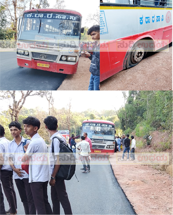 ಮುಂಡಾಜೆ: ಇಲ್ಲಿಯ ರಾಷ್ಟ್ರೀಯ ಹೆದ್ದಾರಿಯ ಸೋಮಂತಡ್ಕದ ಬಳಿ ಕೆ ಎಸ್ ಆರ್ ಟಿ ಸಿ ಬಸ್ ನ ಟಯರ್ ಸ್ಪೋಟ ಆದ ಘಟನೆ ಫೆ.12ರಂದು ಸಂಜೆ ನಡೆದಿದೆ.