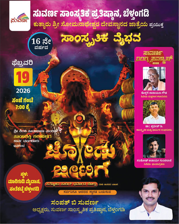 ಉರ್ವ ಶ್ರೀ ಶಿರಡಿ ಸಾಯಿಬಾಬಾ ಮಂದಿರ ಸಾಯಿ ಶಕ್ತಿ ಕಲಾಬಳಗ ಅಭಿನಯಿಸುವ ಜೋಡು ಜೀಟಿಗೆ ಸತ್ಯೋದ ಸಾದಿಗ್ ಧರ್ಮೊದ ಬೊಲ್ಪು ತುಳು ಜನಪದ ನಾಟಕ ಪ್ರದರ್ಶನಗೊಳ್ಳಲಿದೆ. ಹಿರಿಯ ಯಕ್ಷಗಾನ ಕಲಾವಿದ ಕೊಳ್ತಿಗೆ ನಾರಾಯಣ ಗೌಡ, ಸಾಂಸ್ಕೃತಿಕ ಮತ್ತು ಧಾರ್ಮಿಕ ಸಂಘಟಕ ಡಾ.ಪ್ರದೀಪ್ ಆಟಿಕುಕ್ಕೆ ಹಾಗೂ ಸಿನಿಮಾ ಛಾಯಾಗ್ರಹಣಗಾರ ಸಂತೋಷ್ ಆಚಾರ್ಯ ಗುಂಪಲಾಜೆ ಅವರಿಗೆ ಸುವರ್ಣ ರಂಗ ಸಮ್ಮಾನ್-೨೦೨೬ ಪ್ರಶಸ್ತಿ ನೀಡಿ ಗೌರವಿಸಲಾಗುತ್ತದೆ.