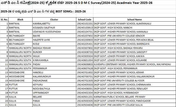 ಬೆಳ್ತಂಗಡಿ: 2025-26 ರ ಅತ್ಯುತ್ತಮ ಎಸ್.ಡಿ.ಎಂ.ಸಿ ಗಳ ಪಟ್ಟಿಯು ಬಿಡುಗಡೆಯಾಗಿದ್ದು ಇದರಲ್ಲಿ ಬೆಳ್ತಂಗಡಿ ತಾಲೂಕಿನಲ್ಲಿ ಮೂರು ಶಾಲೆ ಆಯ್ಕೆಯಾಗಿದೆ.