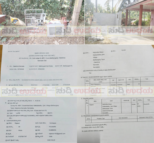 ಉಜಿರೆ: ಉಜಿರೆ ಗ್ರಾಮದ ಕಕ್ಕರೆಬೆಟ್ಟು ನಿವಾಸಿ ರಾಜೀವಿ ಎಂಬವರು ಉಜಿರೆ ಗ್ರಾಮದ ಕಕ್ಕರೆಬೆಟ್ಟು ಎಂಬಲ್ಲಿ ಅವರ ಸ್ವಾಧೀನದಲ್ಲಿರುವ ಸರ್ವೆ ನಂ: 406/1 ರಲ್ಲಿ ಮನೆ ನಿರ್ಮಿಸುತ್ತಿದ್ದು ಫೆ.27 ರಂದು 11 ಗಂಟೆಗೆ ರಾಜೀವಿ ಹಾಗೂ ಅವರ ಗಂಡ ಕೆಲಸಕ್ಕೆ ಹೋಗಿದ್ದ ಸಮಯದಲ್ಲಿ ಆರೋಪಿ ರಫೀಕ್ ಎಂಬಾತ ಮನೆಗೆ ಅಕ್ರಮ ಪ್ರವೇಶ ಮಾಡಿ ಮನೆ ಹಾಗೂ ಮನೆಯಲ್ಲಿದ್ದ ಟಿ, ಪಿ, ಪ್ರಿಡ್ಜ್, ಗ್ಯಾಸ್ ಸಿಲಿಂಡರ್, ಪಿಠೋಪಕರಣಗಳನ್ನು, ಮತ್ತು ಬಟ್ಟೆ ಬರೆ, ದಿನಸಿ ಸಾಮಾನು ಇತ್ಯಾದಿ ವಸ್ತುಗಳನ್ನು ಬೀಸಾಡಿದ್ದು ಈ ಕೃತ್ಯದ ವಿಡಿಯೋ ಮಾಡುತ್ತಿದ್ದ ಪಿರ್ಯಾದಿದಾರರ ಮಗಳಿಗೆ ” ನೀನು ಏನಾದರೂ ದೂರನ್ನು ನೀಡಿದರೆ ನಿನ್ನನ್ನು ಹಾಗೂ ನಿನ್ನ ಮನೆಯವರನ್ನು ಜೀವಸಹಿತ ಬೀಡುವುದಿಲ್ಲ,” ಎಂದು ಜೀವ ಬೆದರಿಕೆ ಹಾಕಿರುವುದಾಗಿ ಆರೋಪಿಸಲಾಗಿದೆ.ಈ ಕೃತ್ಯದಿಂದ ರಾಜೀವಿ ಅವರಿಗೆ ಸುಮಾರು ರೂ.10,00,000 ದಷ್ಟು ನಷ್ಟವುಂಟಾಗಿದೆ ಎಂದು ಬೆಳ್ತಂಗಡಿ ಪೊಲೀಸ್ ಠಾಣೆಗೆ ದೂರು ನೀಡಲಾಗಿತ್ತು.